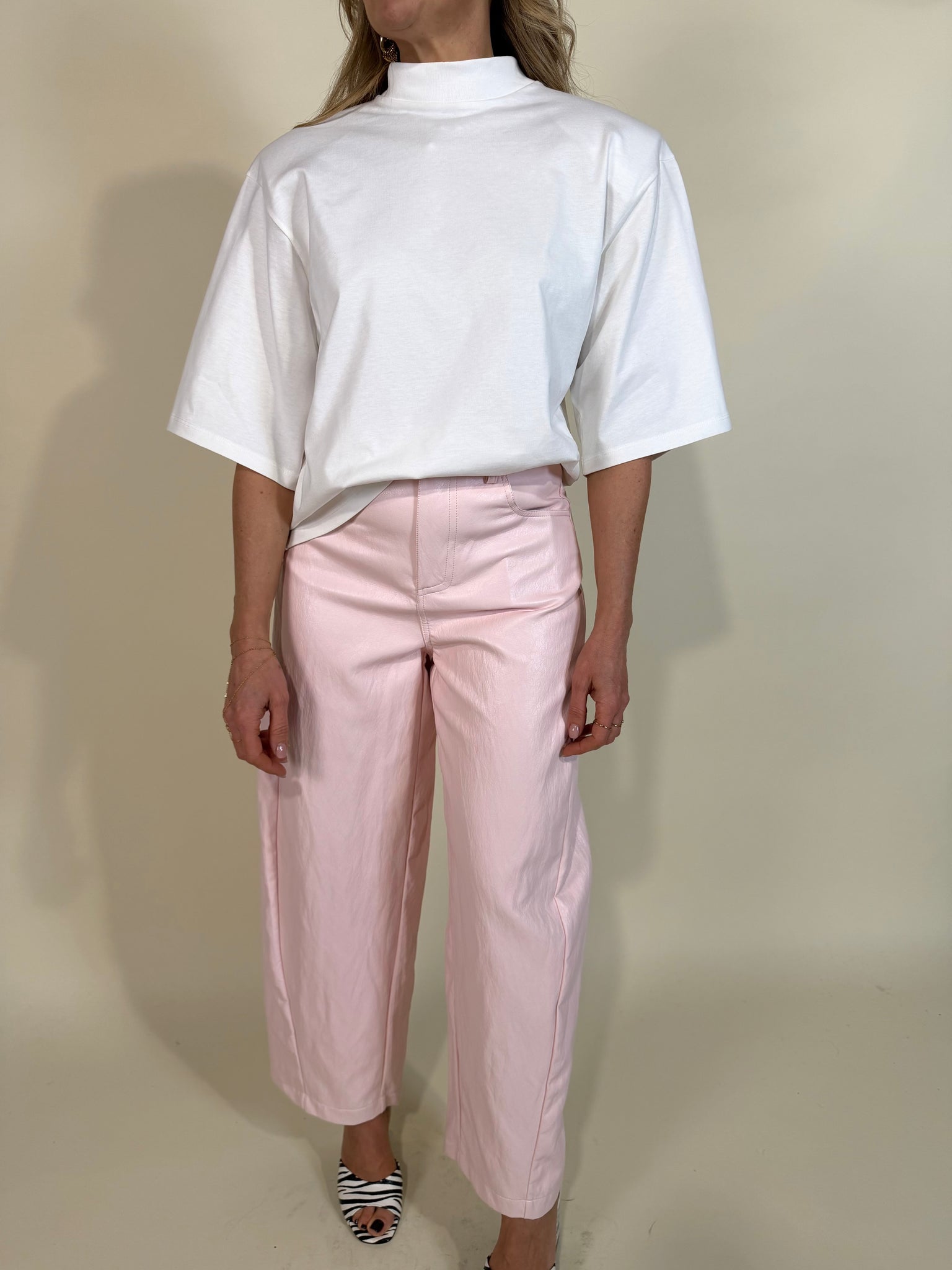 T-shirt in cotone modello con maxi spalla imbottita disponibile nelle varianti colore bianco gesso, moro e nero. Modello con collo alto a dettaglio.