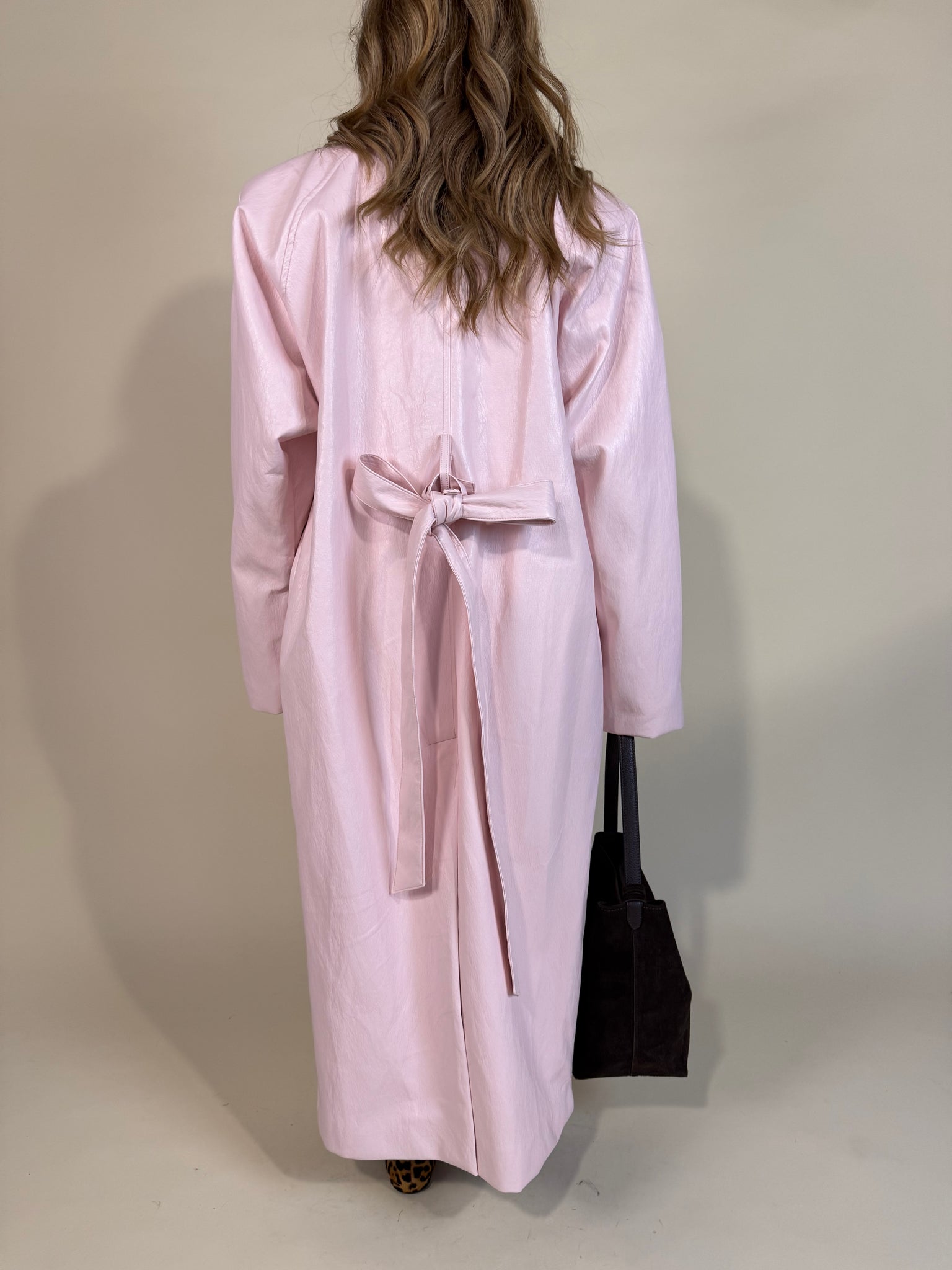 Trench in ecopelle e viscosa modello oversize disponibile nelle varianti colore banana, nero, rosa baby e moro. Modello con spalla imbottita e rever ampi. Modello con chiusura a doppio bottone centrale tono su tono. Modello con cintura in vita tono su tono. Maxi lunghezza. Fodera interna.