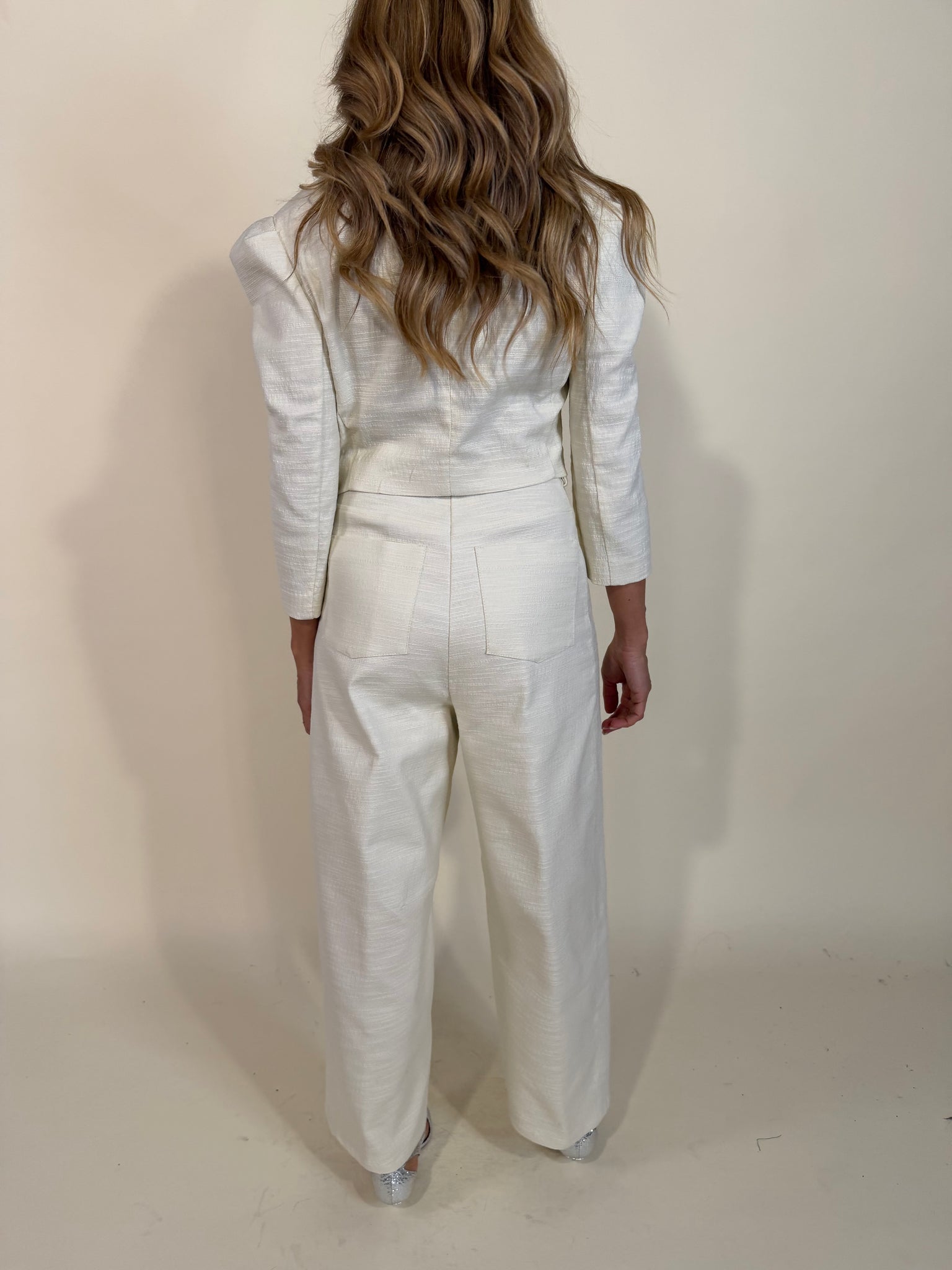 Pantalone modello balloon a vita alta in misto cotone e viscosa disponibile nella variante colore unica avorio. Tessuto strutturato. Modello cinque tasche e chiusura con zip e bottone unico.