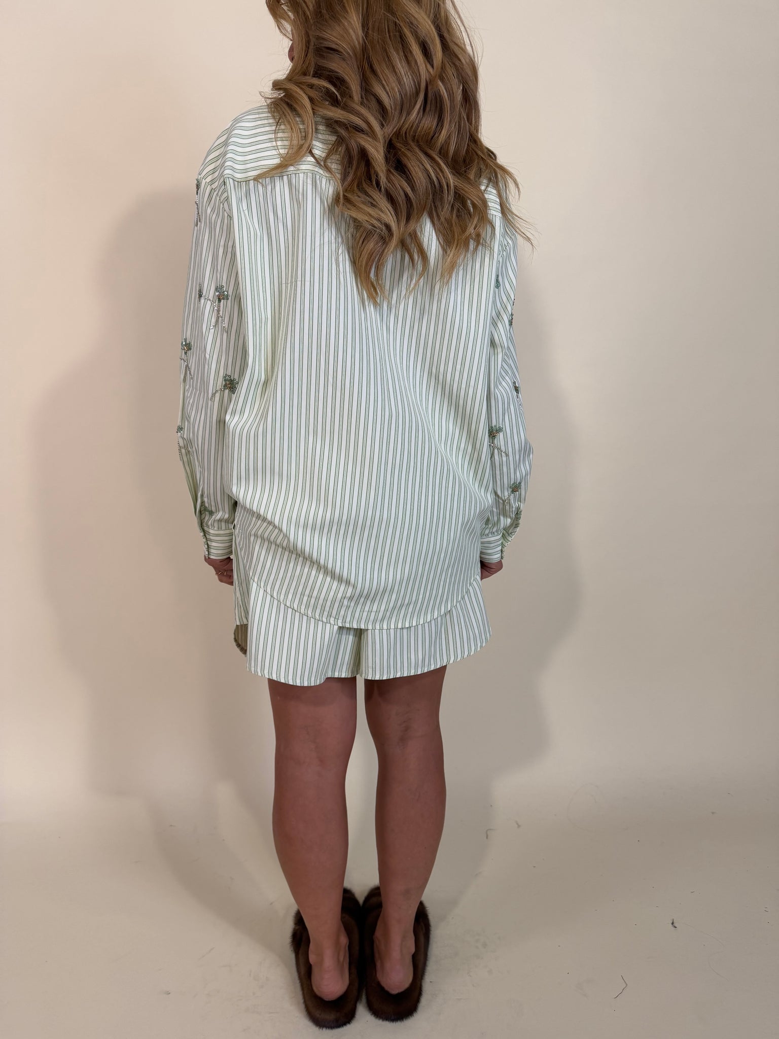 Shorts disponibile nella variante a trama a righe sui toni del bianco e del verde menta. Modello con elastico in vita e coulisse. Modello con strass applicati frontali e retro liscio. Shorts foderati.