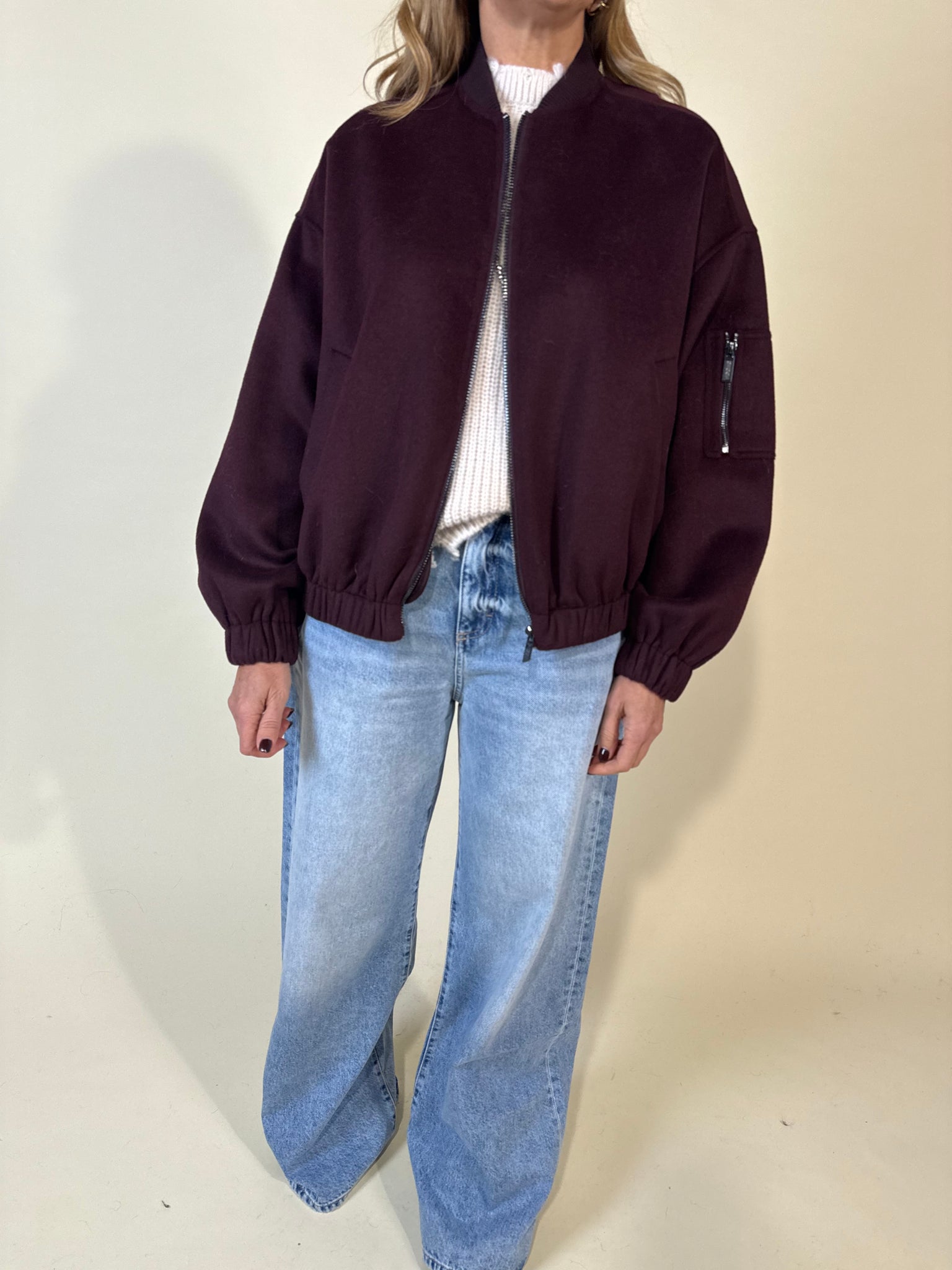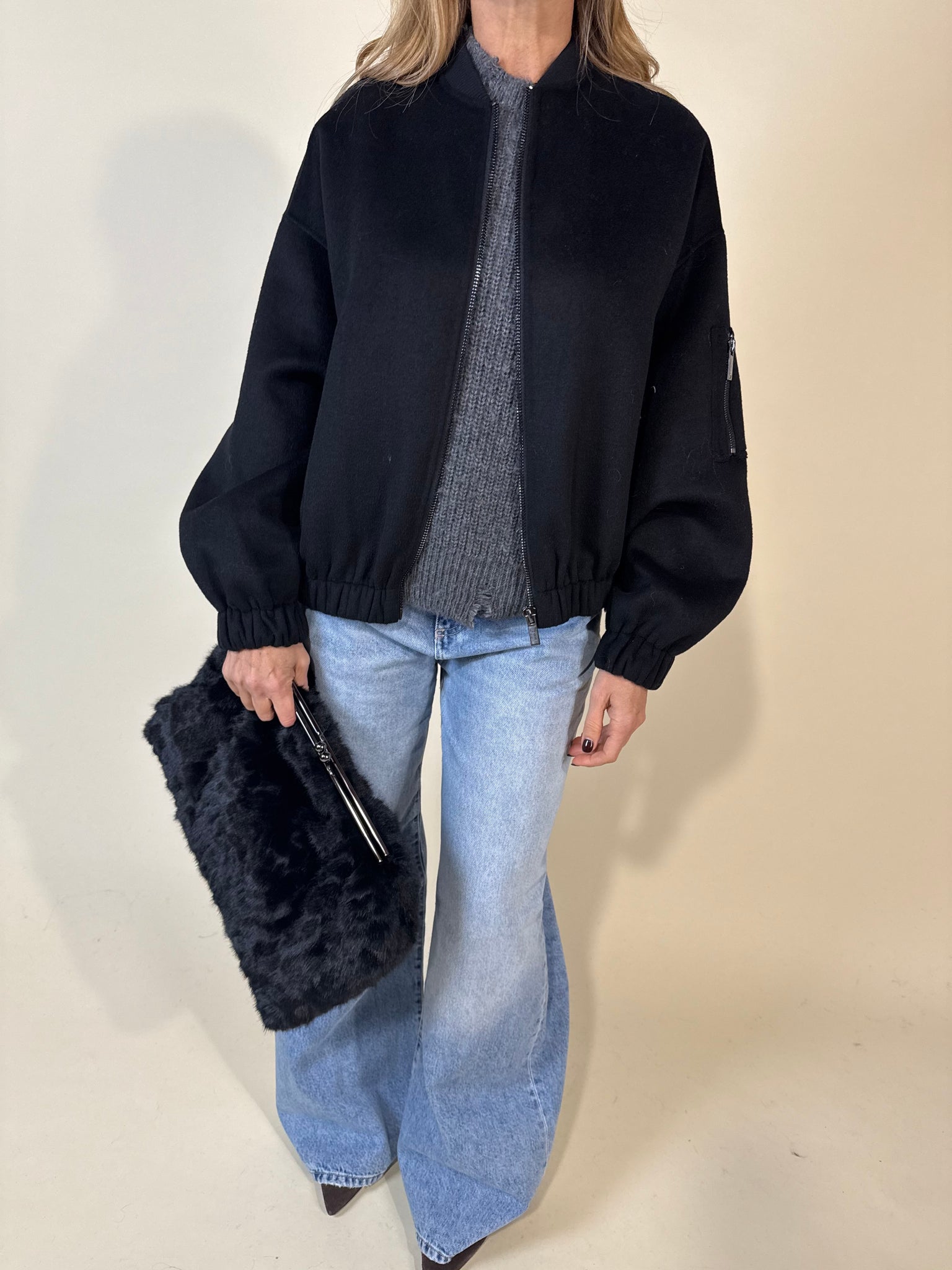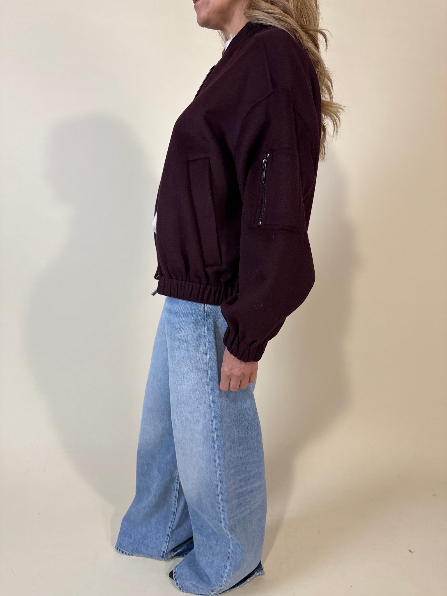 Bomber modello in tessuto disponibile nella variante colore vino, grigio antracite e nera. Dettaglio colletto a costina tono su tono, chiusura con zip centrale in acciaio. Dettaglio fondo capo con maxi arricciatura. Manica ampia e maxi tasche laterali frontali. Foderato.