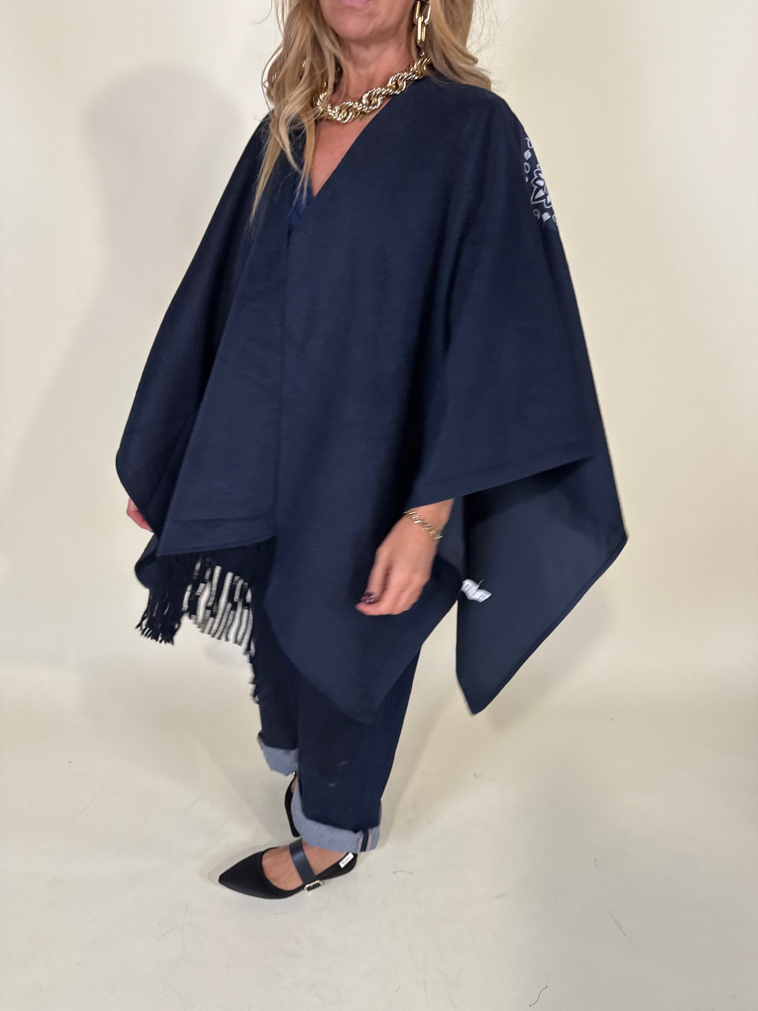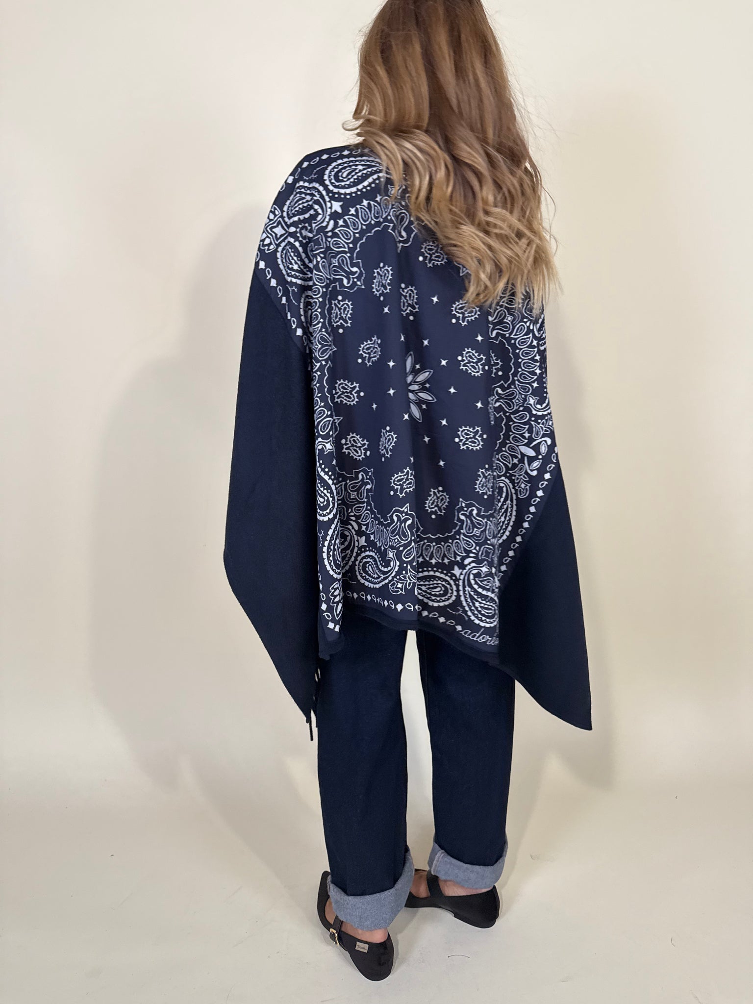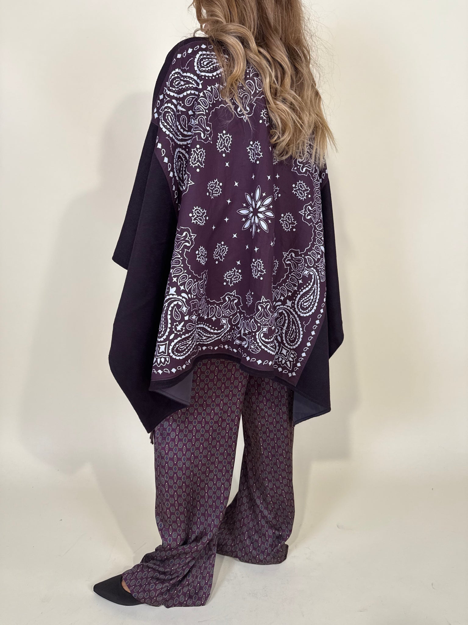 Cardigan modello caban disponibile nella variante colore bordeaux e blu notte. Dettaglio stampa sul retro a bandana tono su tono. Cinturina annessa in simil pelle tono su tono.