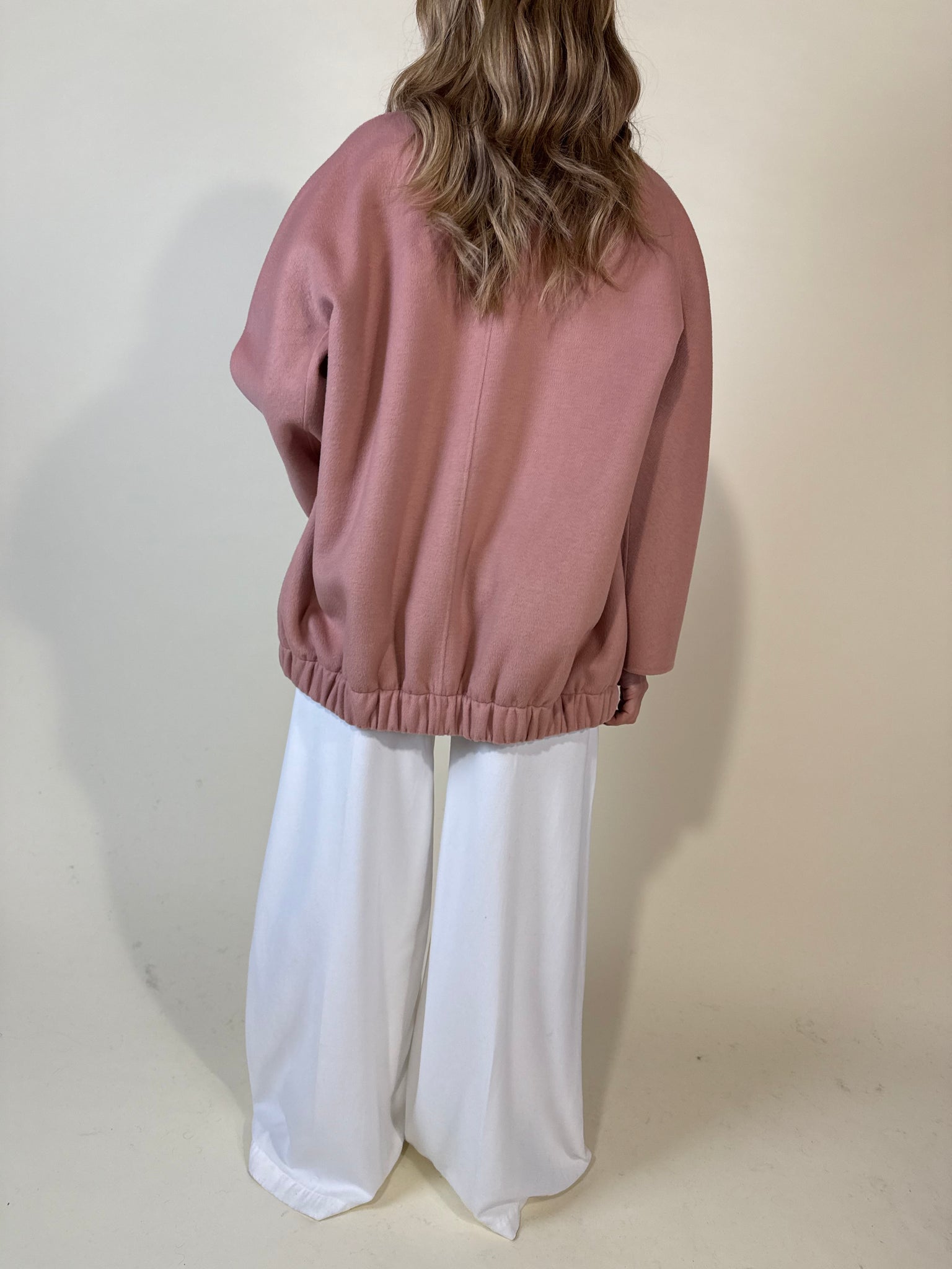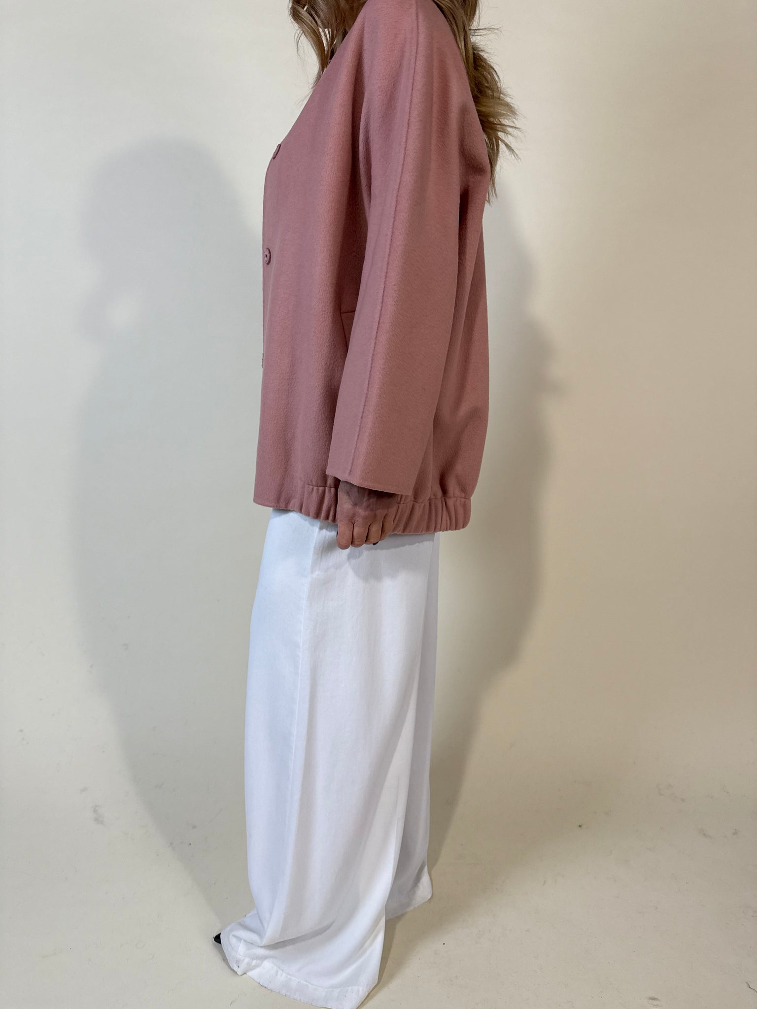 Cappotto monopetto caban disponibile nel colore rosa cipria e bianco latte. Cappotto con chiusura clip e tasche laterali. Cappotto con cucito a mano in tessuto double. Tessuto 50% lana 50% poliestere