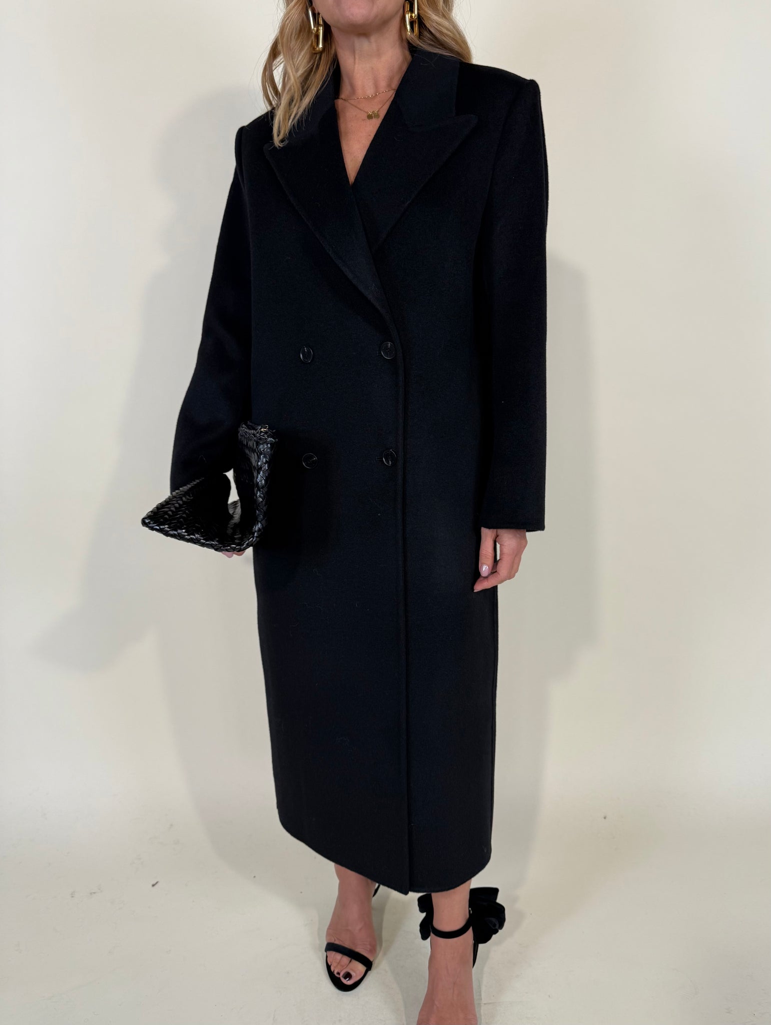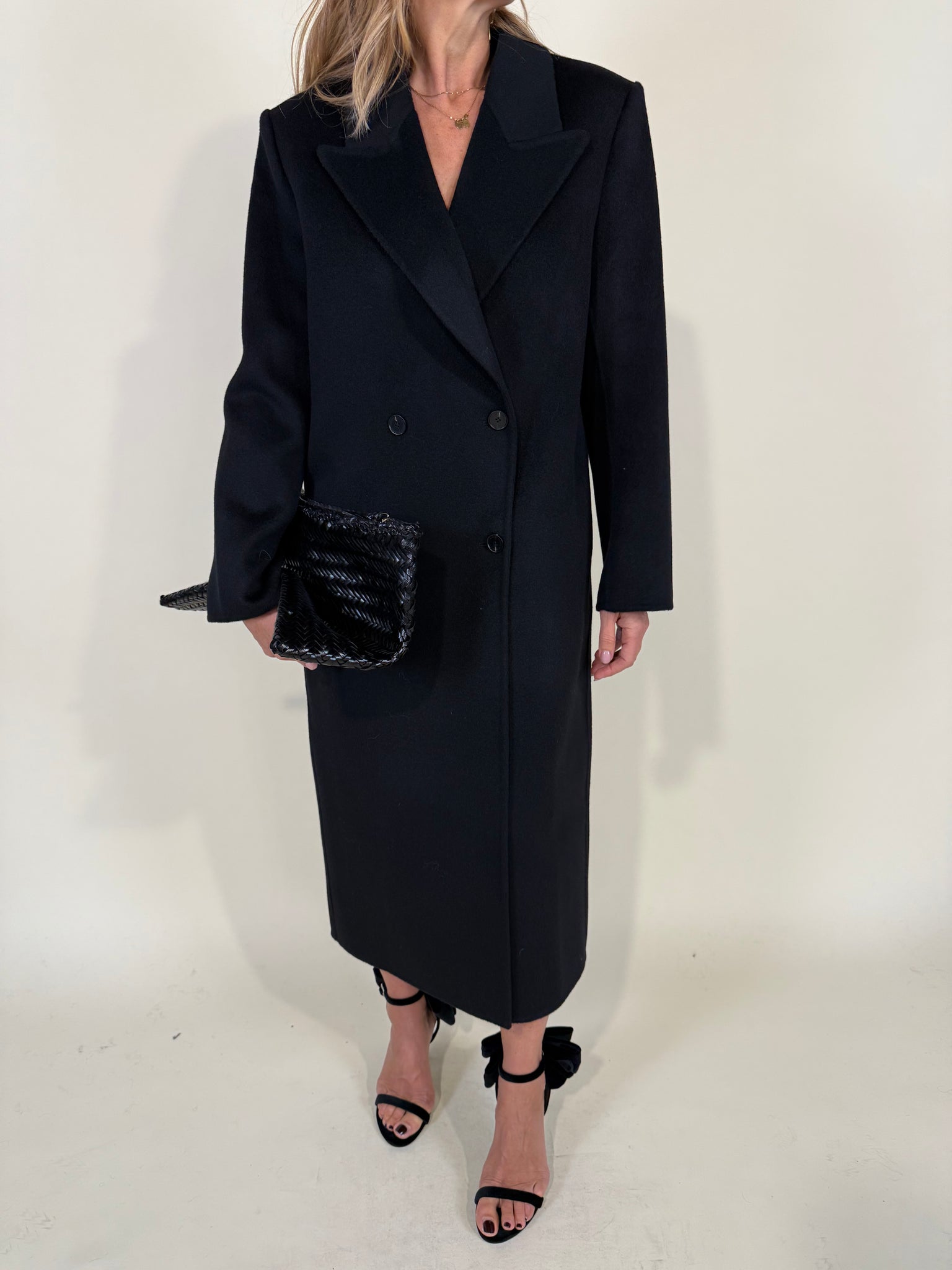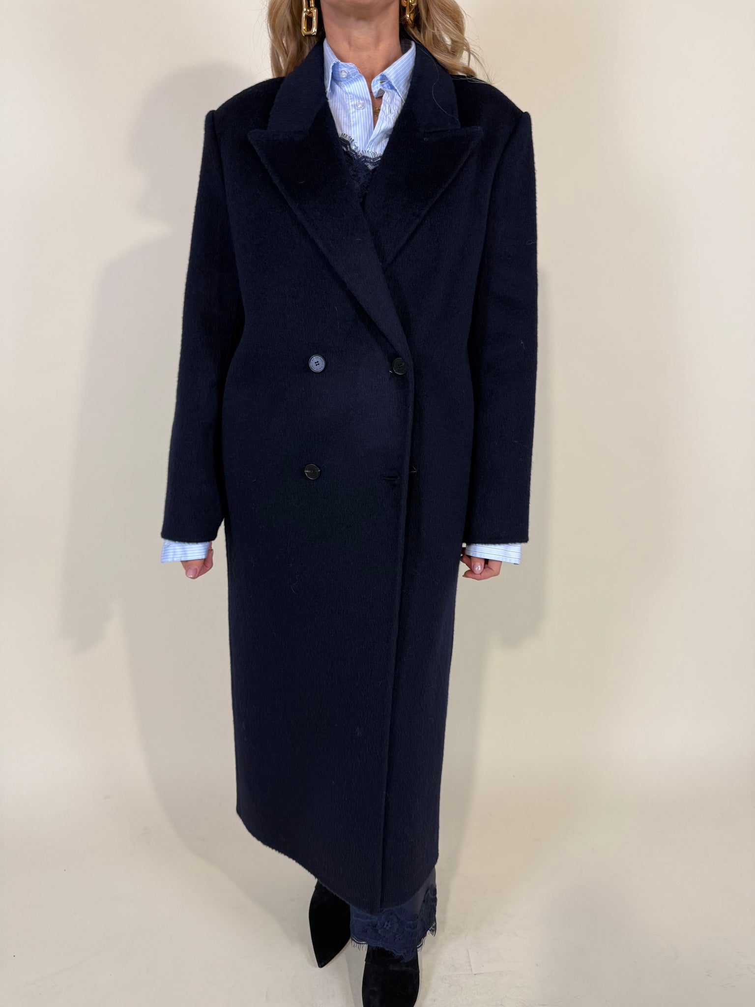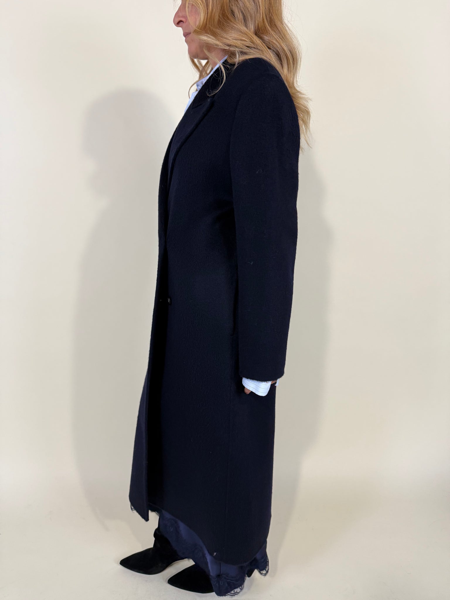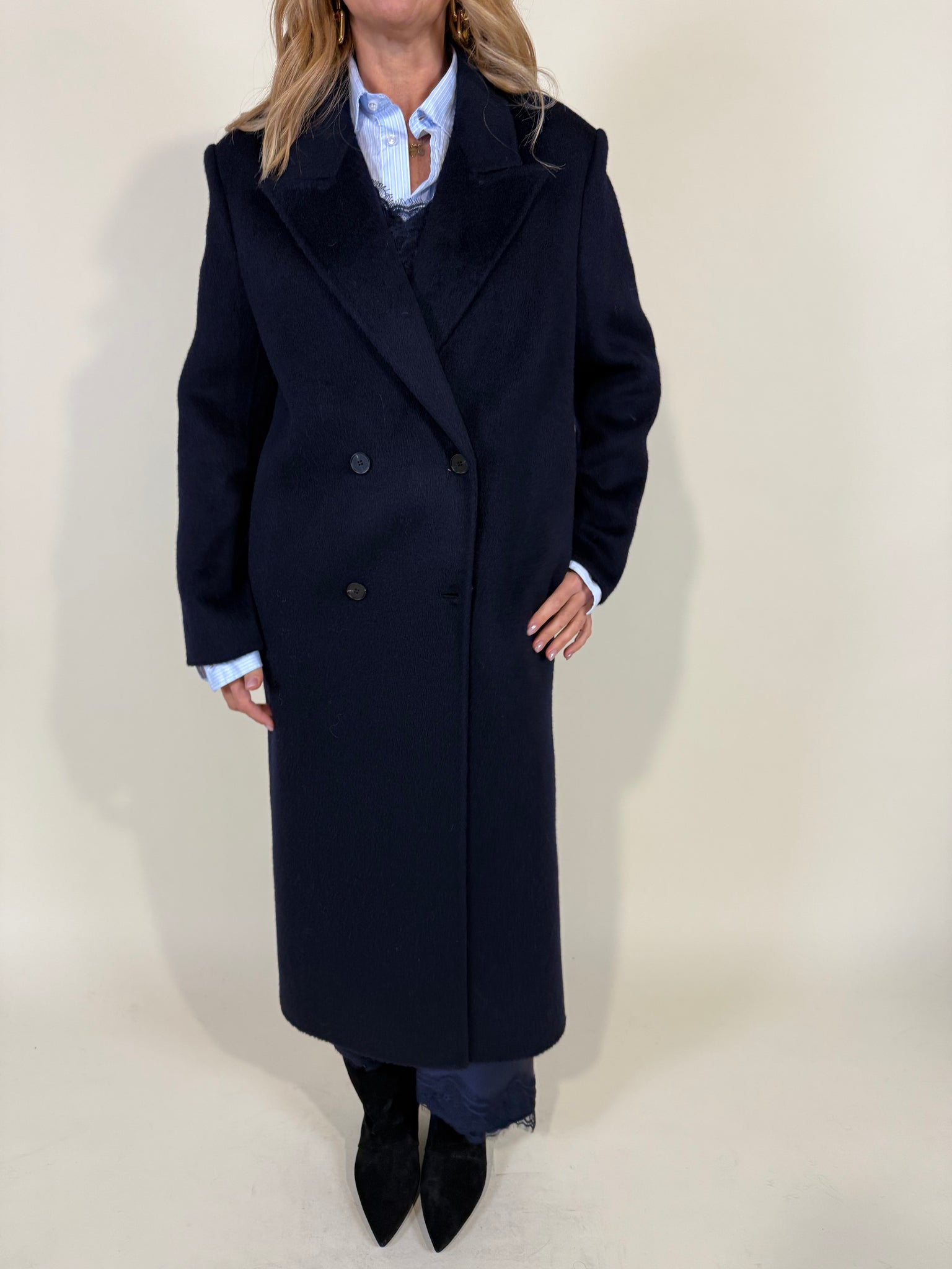 Cappotto doppiopetto in lana double nella variante colore blu notte e nero. Modello regolare lungo con spalla rigida e rever ampi a lancia. Modello doppiopetto a bottoni tono su tono.