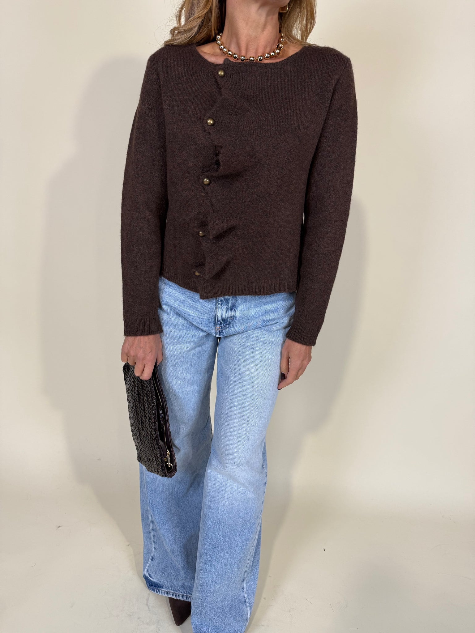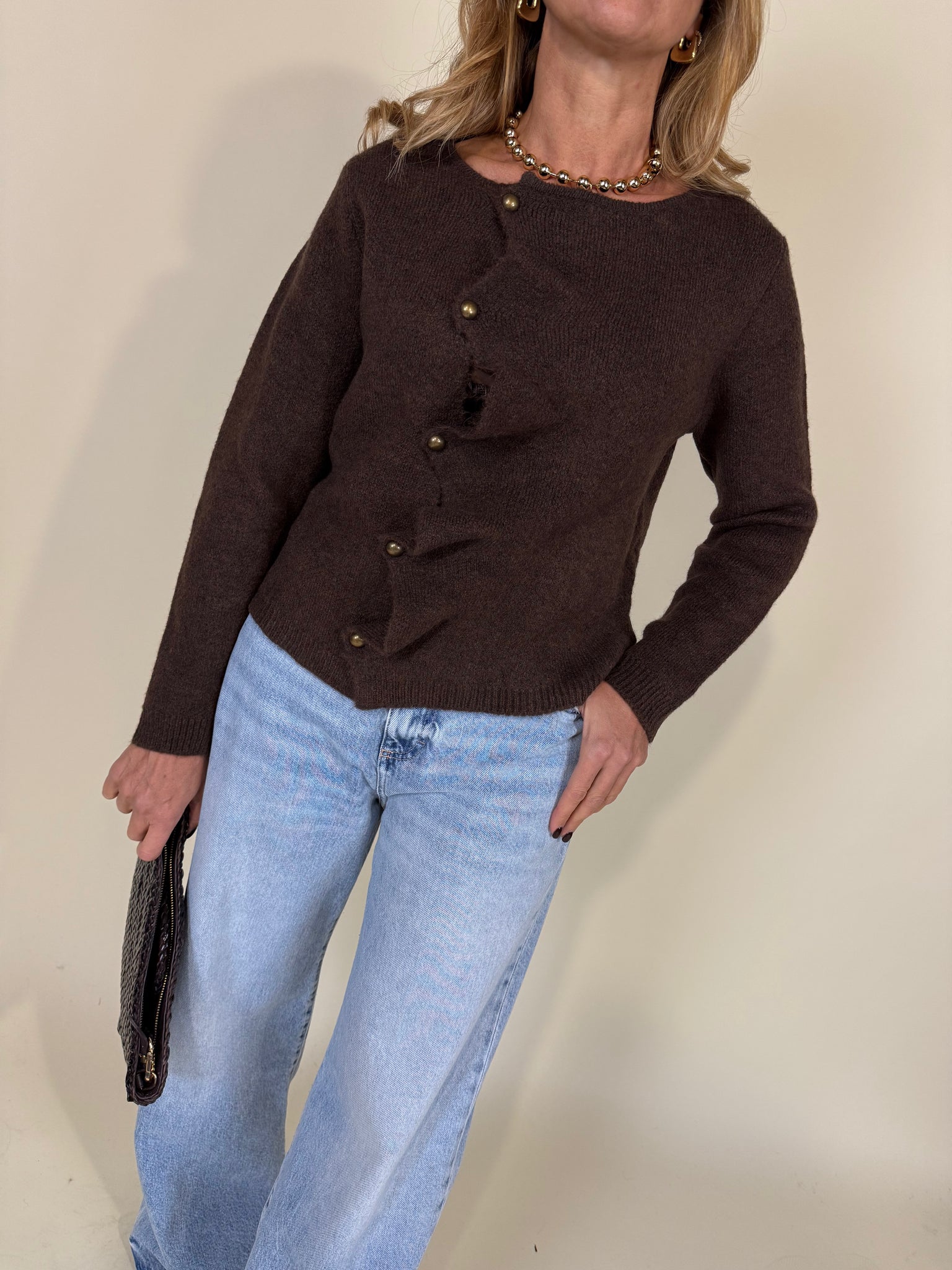 Cardigan disponibile nella variante colore nude e moro con dettaglio chiusura a bottoni dorati e profilo a balza morbido. Modello con scollo a barchetta.