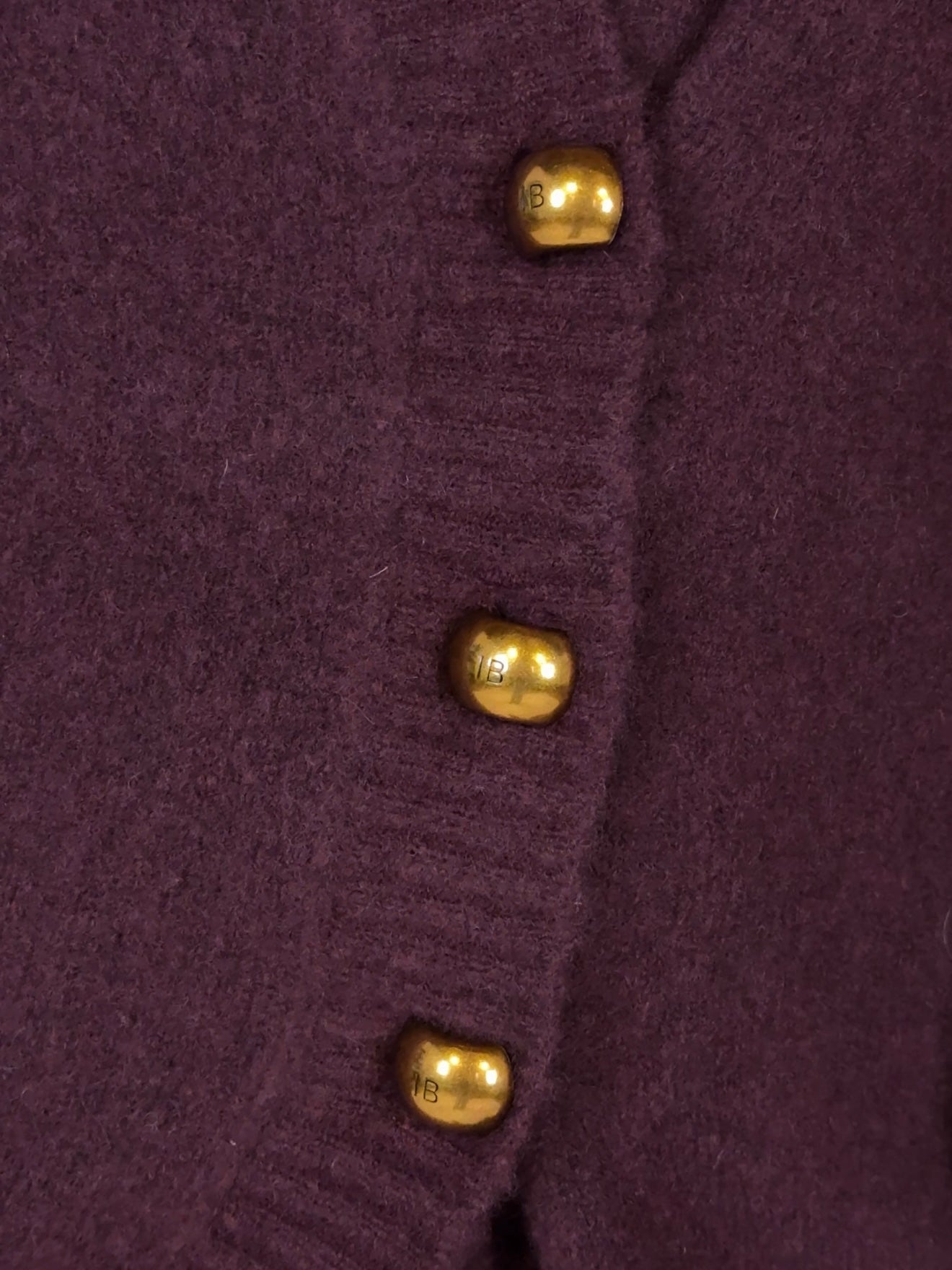 Cardigan sartoriale in maglia in misto lana disponibile nella variante colore bordeaux con dettaglio chiusura a bottoni laterali dorati. Filato morbidissimo e caldissimo.