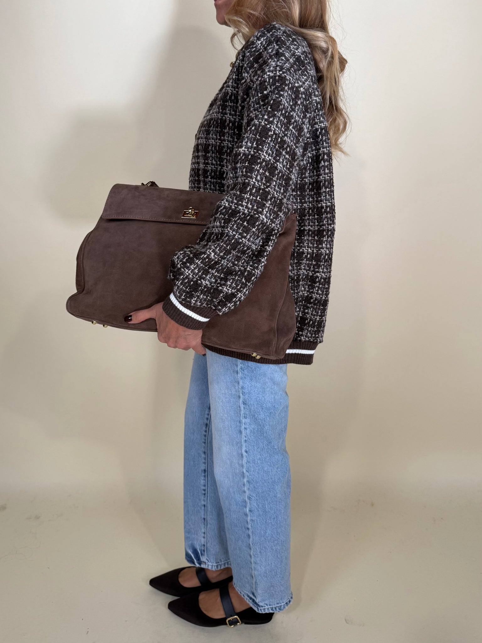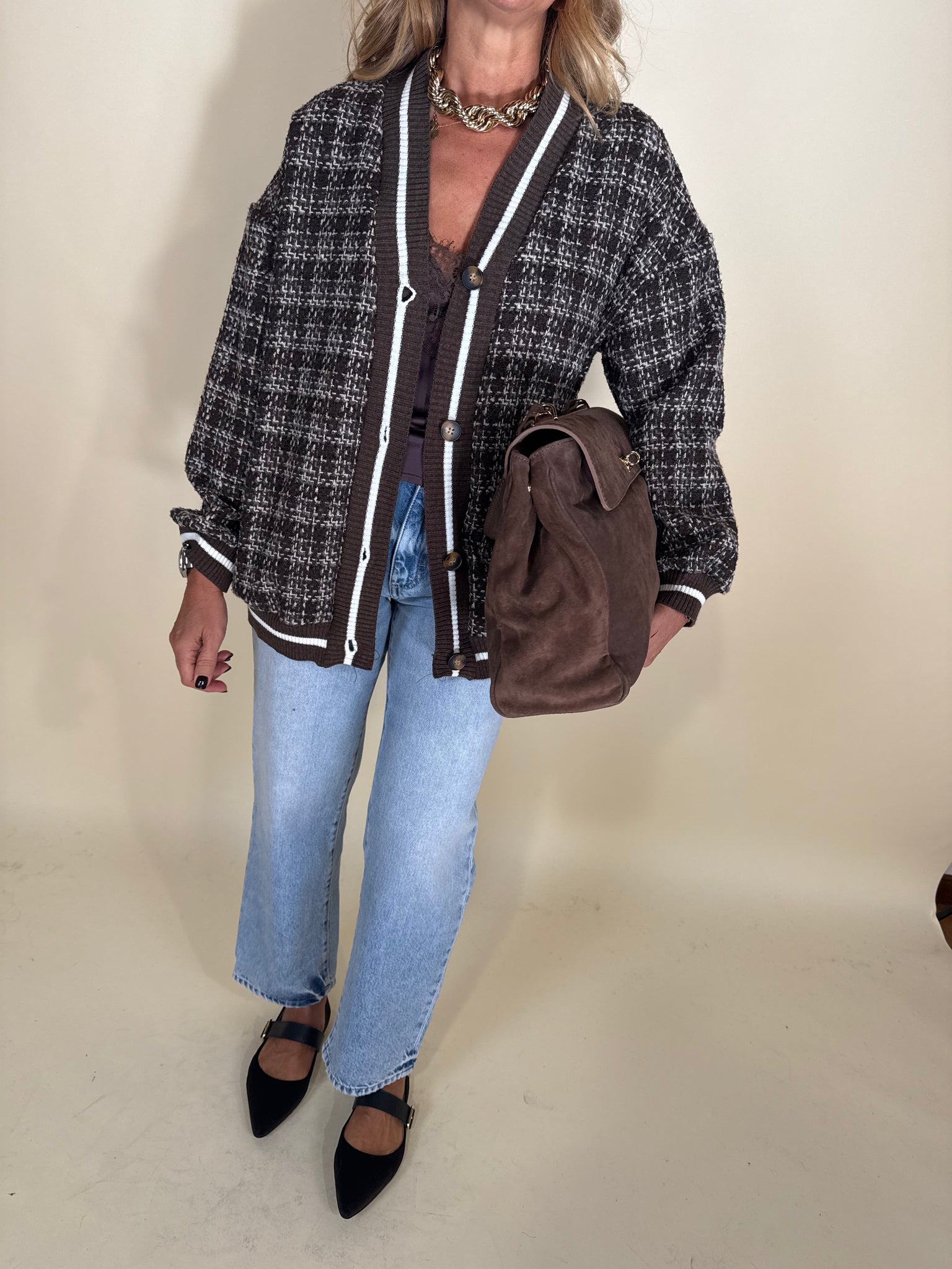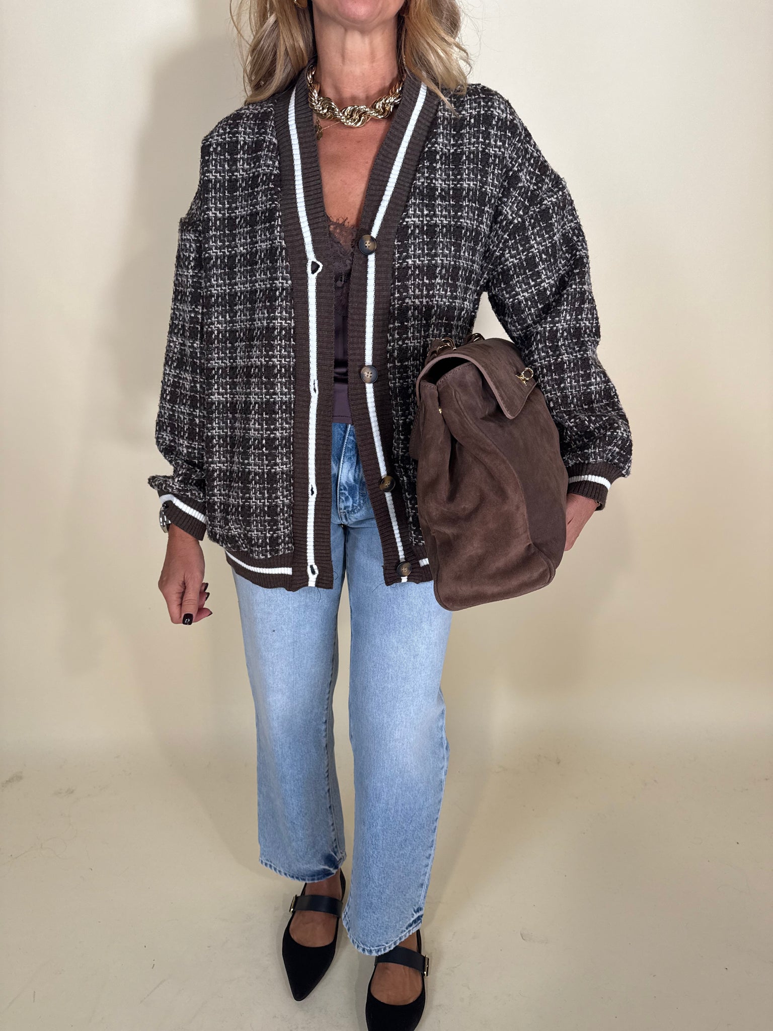 Cardigan modello full nella variante colore moro in stampa fantasia check tono su tono. Dettaglio profili a costina a riga bianca e moro. Chiusura con bottoni tono su tono frontali. Sfoderato.