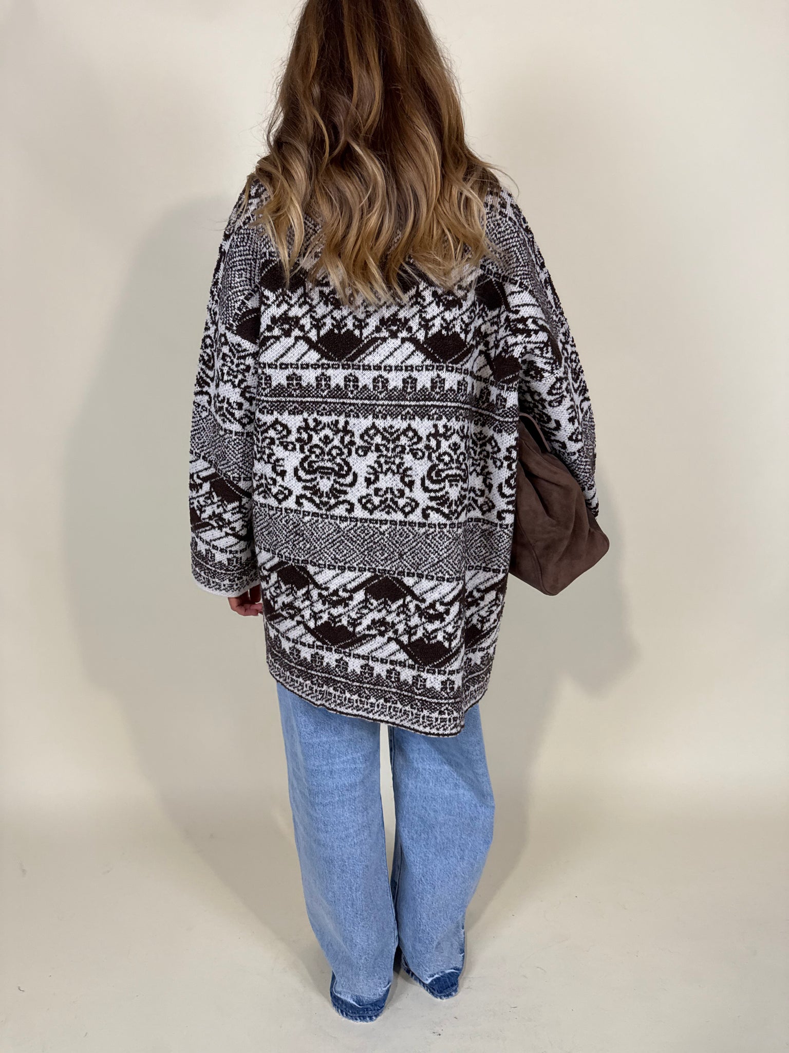 Cardigan nella stampa fantasia etnica sui toni del panna e del moro con dettaglio frangia in suede a profilo rever a contrasto. Chiusura con cinturina sui toni del panna a contrasto.