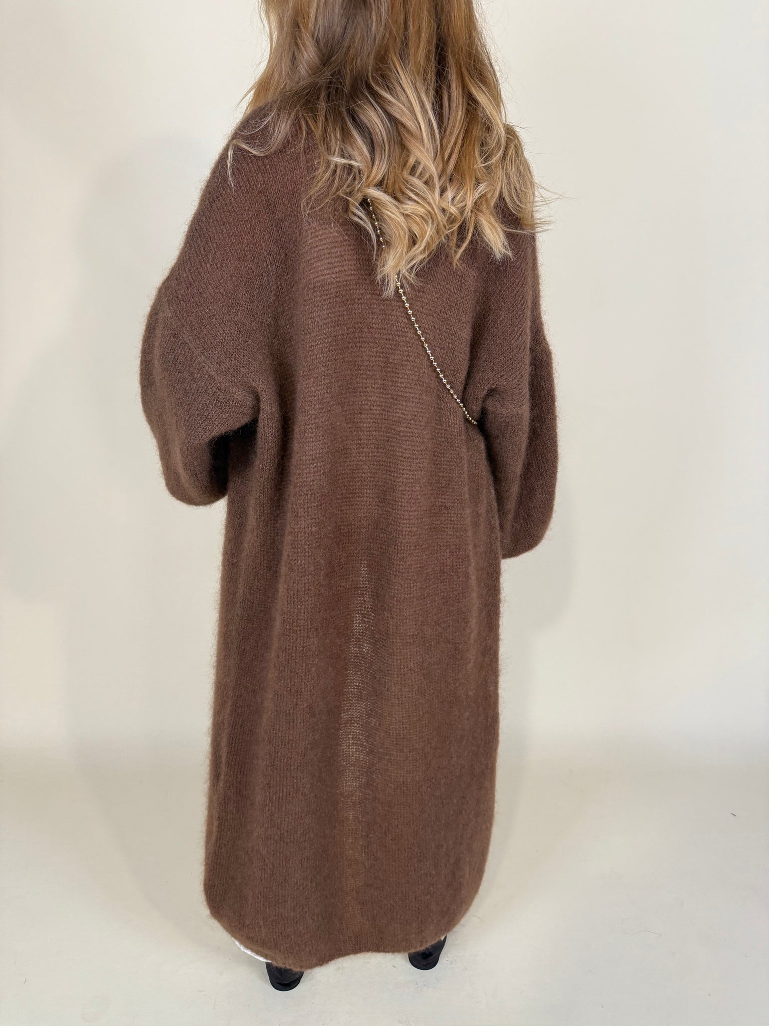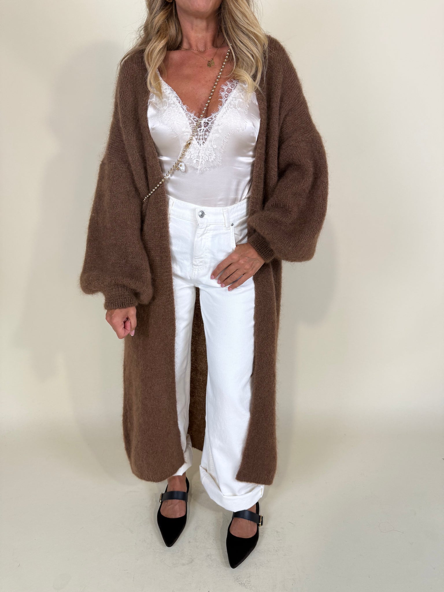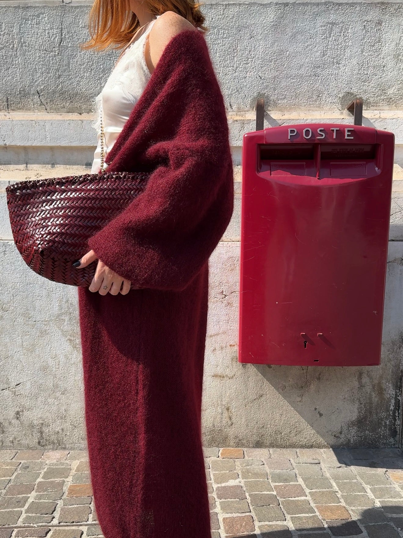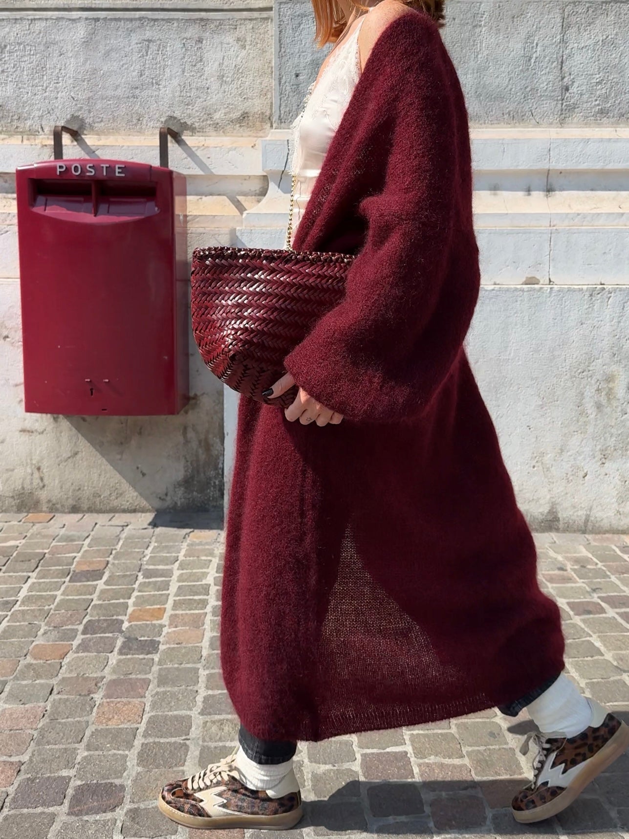 Cardigan lungo senza chiusura disponibile nelle varianti colore camel e rosso borgogna. Modello misto mohair con manica morbida a buffetto.