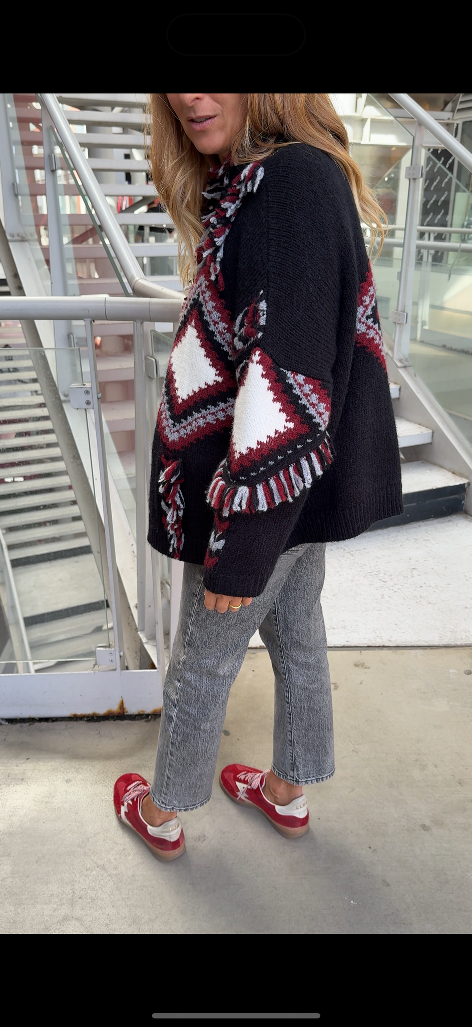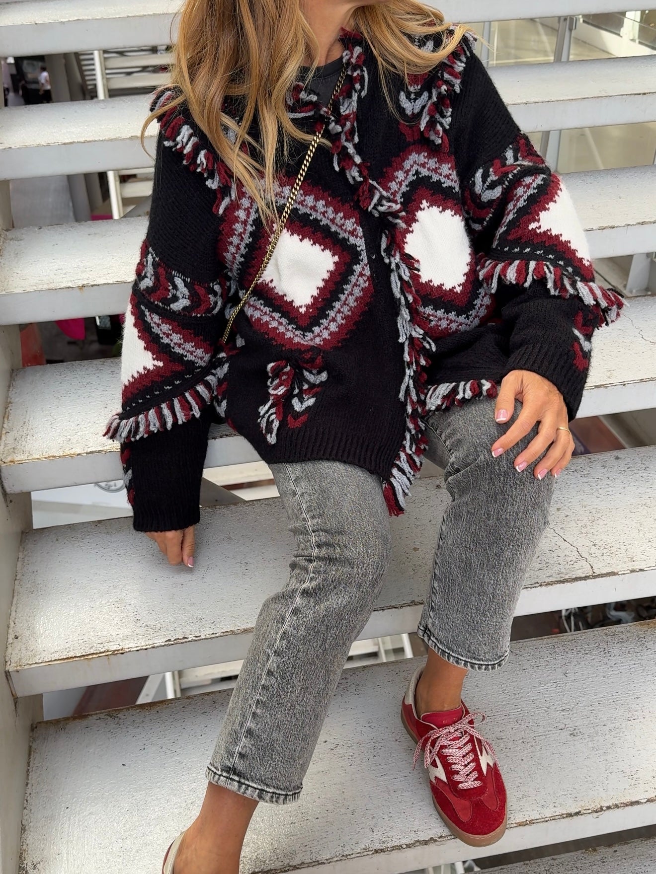 Cardigan Wally modello morbido. Taglia unica vestibilità 38-40-42-44. Disponibile nella variante nera con dettagli grigi e bordeaux/rossi.