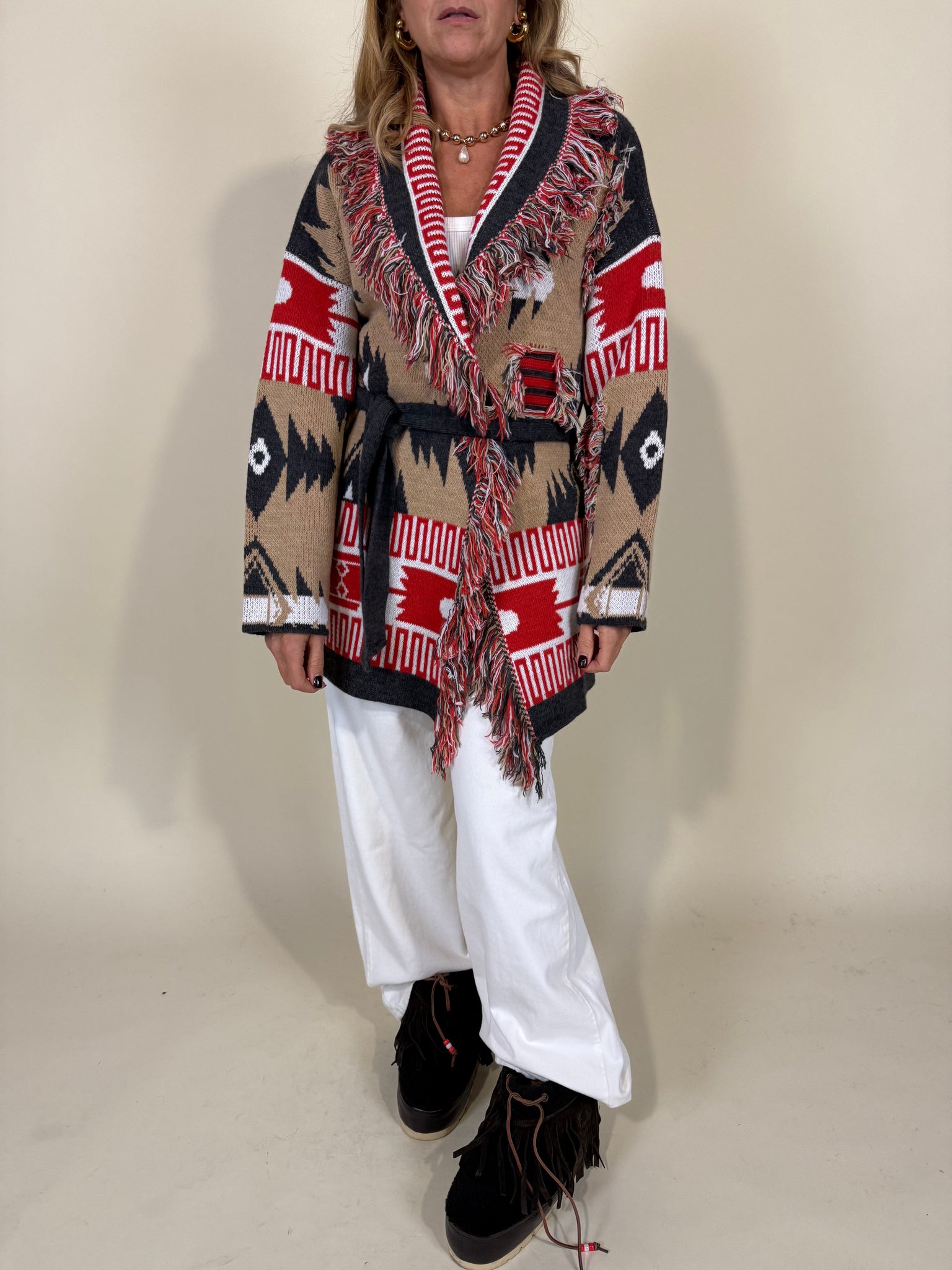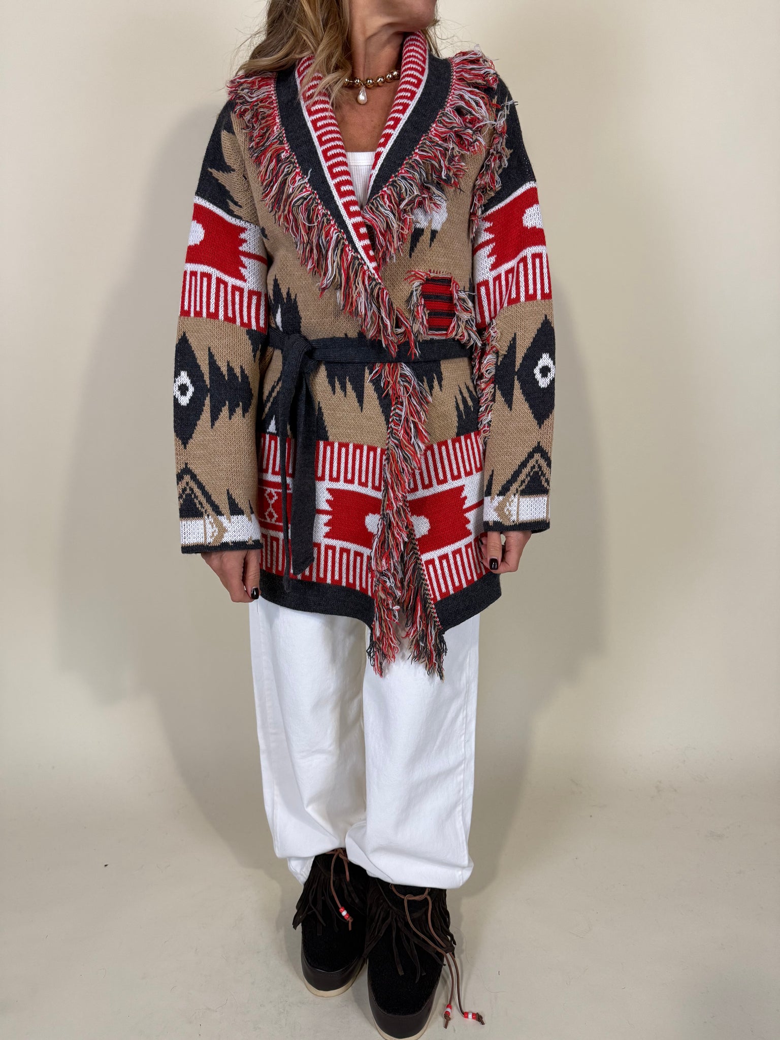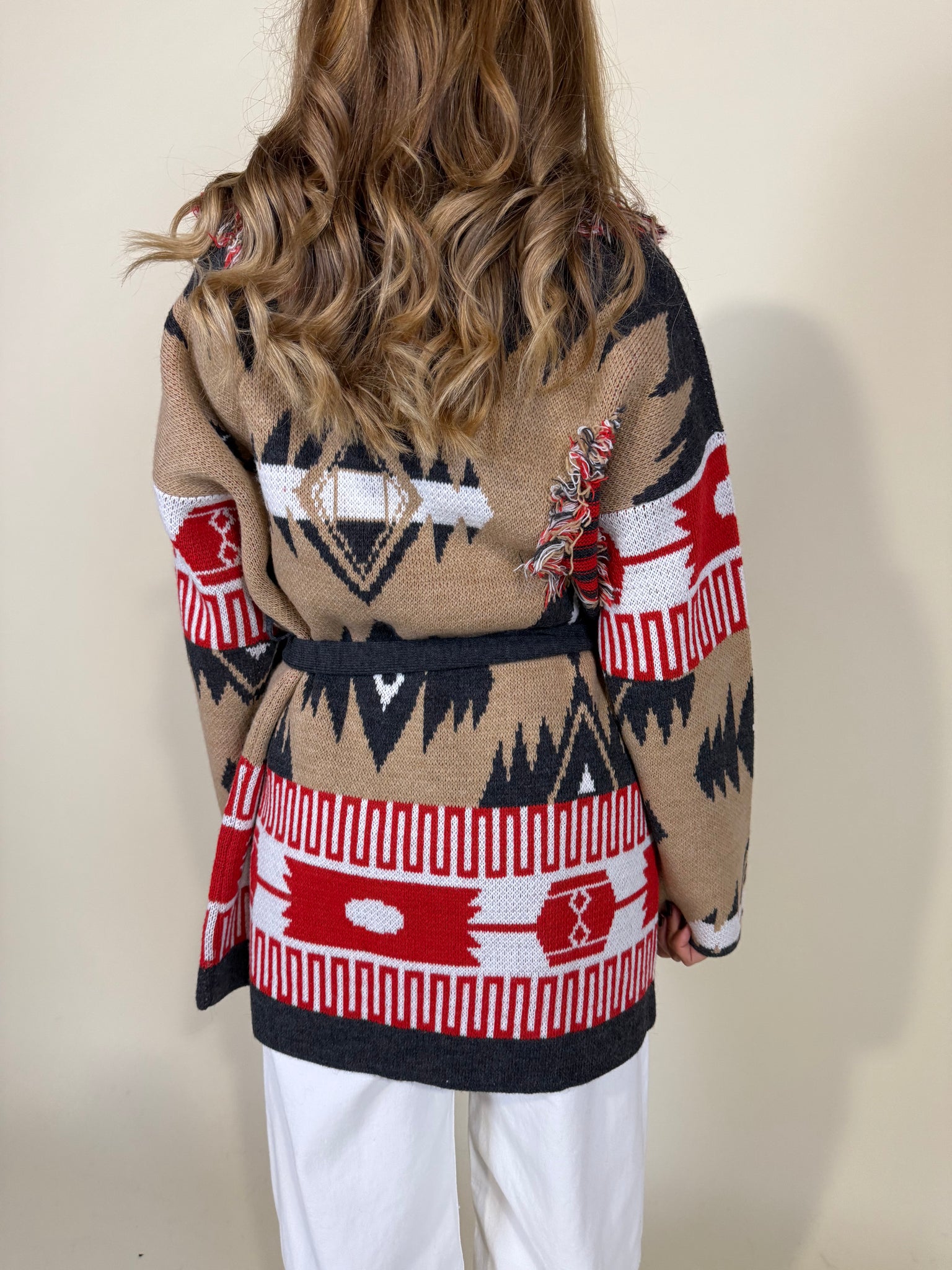 Cardigan midi disponibile nella variante colore camel con dettagli a colore rosso acceso. Modello a rever morbido con dettagli sfrangiatura a profilo e applicati frontali. Modello cinturato tono su tono.