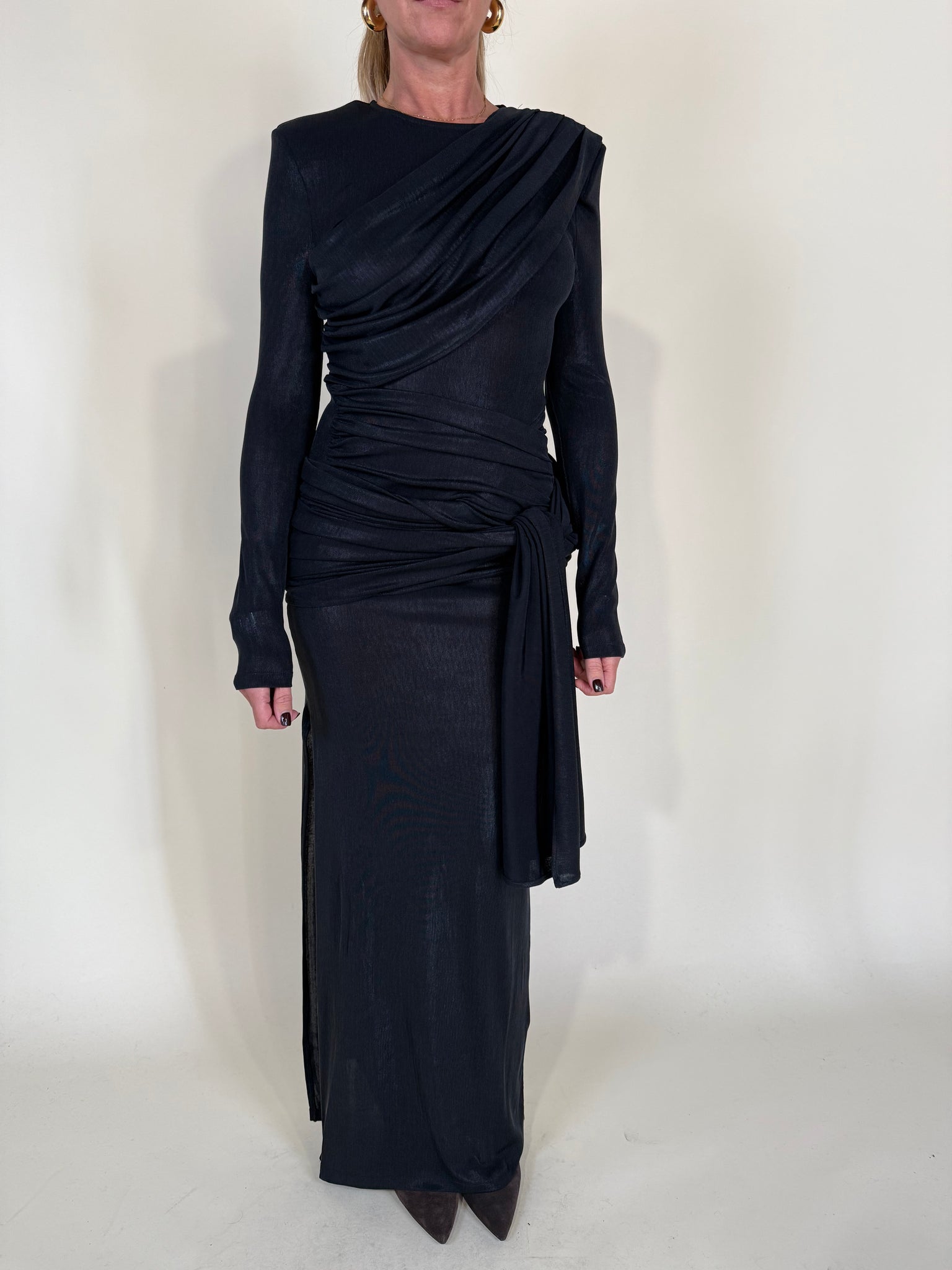 Abito lungo con spallina imbottita. Modello attillato con dettagli drappeggio. Tessuto simil spalmato shimmer.