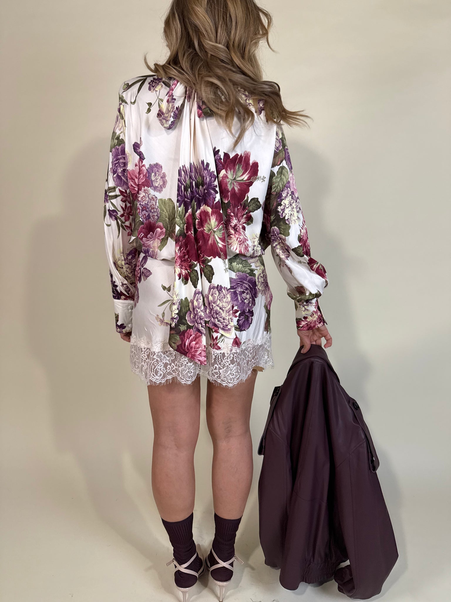 Abito modello corto disponibile nella variante a fantasia floreale unica fiori su panna. Modello con colletto e chiusura a fiocco sul retro. Modello manica lunga e fondo abito con ricamo in pizzo tono su tono.