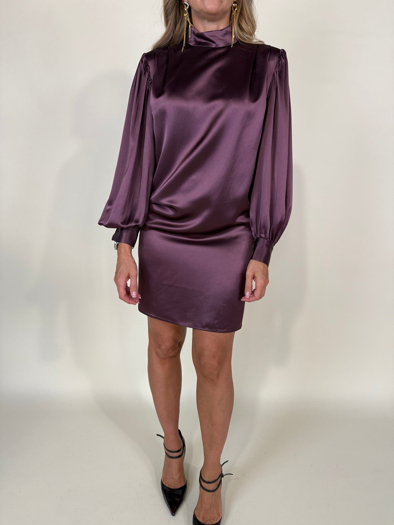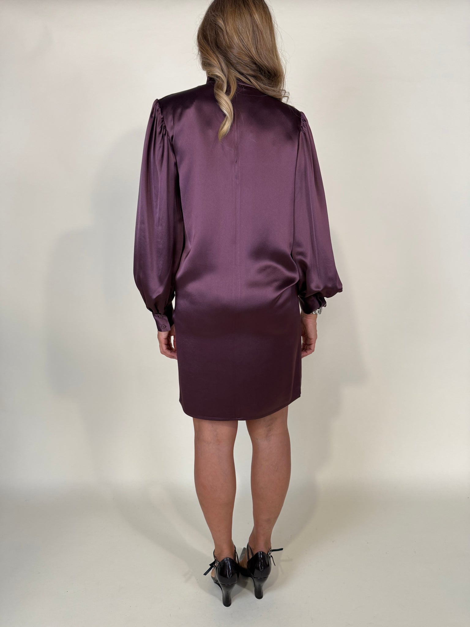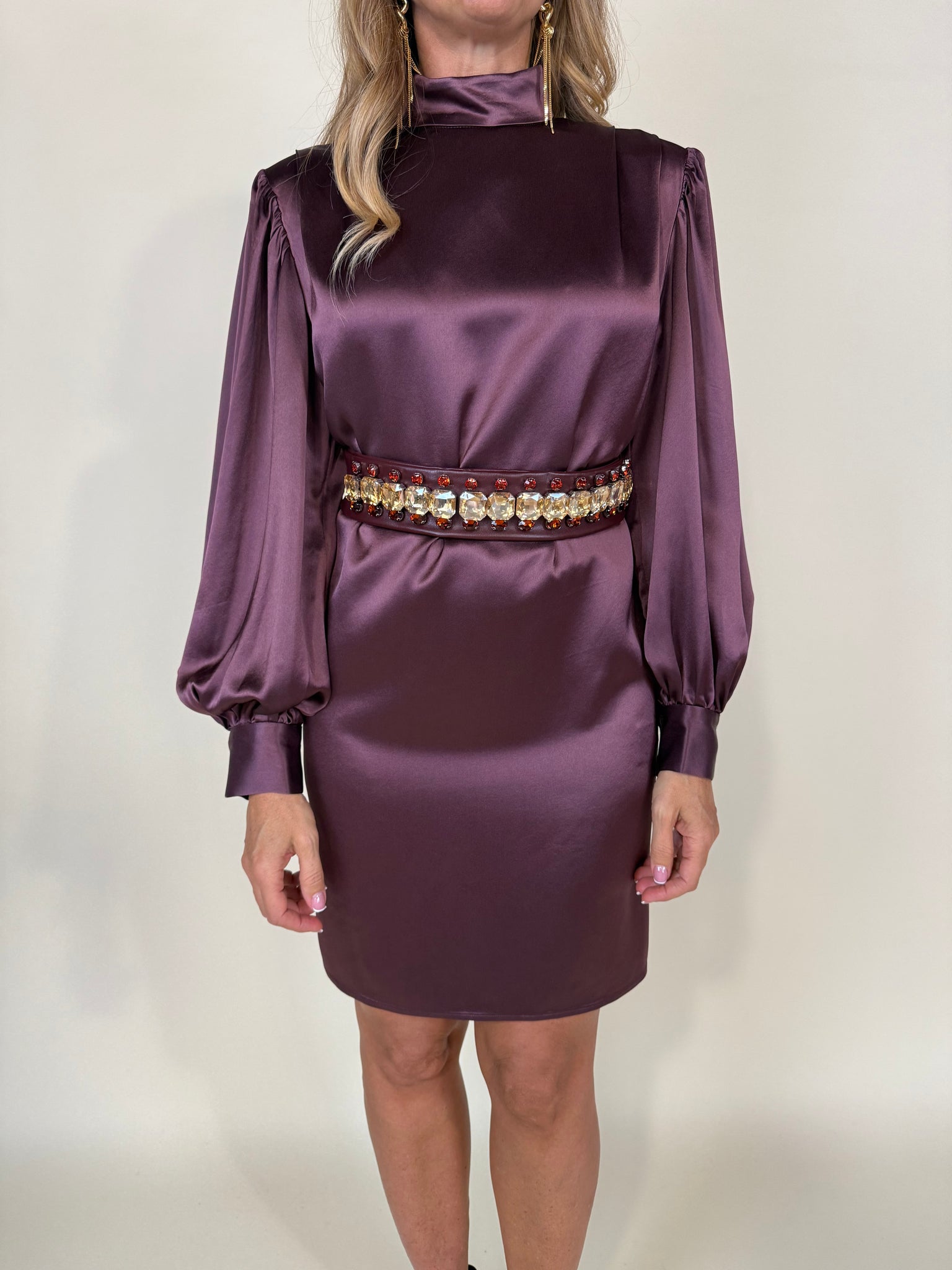 Abito corto in manica lunga nella variante colore unica vino. Dettaglio colletto e manica a sbuffetto. Chiusura collo sul retro con bottoncini tono su tono. Dettaglio cintura in ecopelle tono su tono con chiusura a bottoni a pressione, impreziosita da pietre colorate luminose a ricamo.
