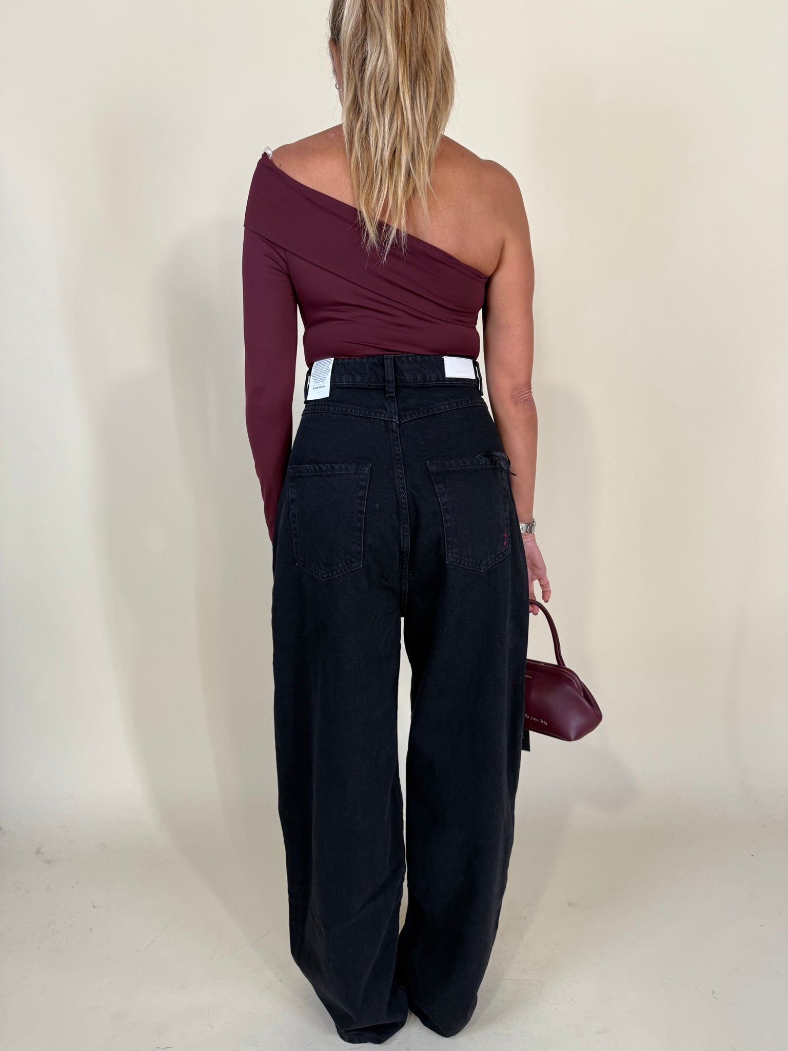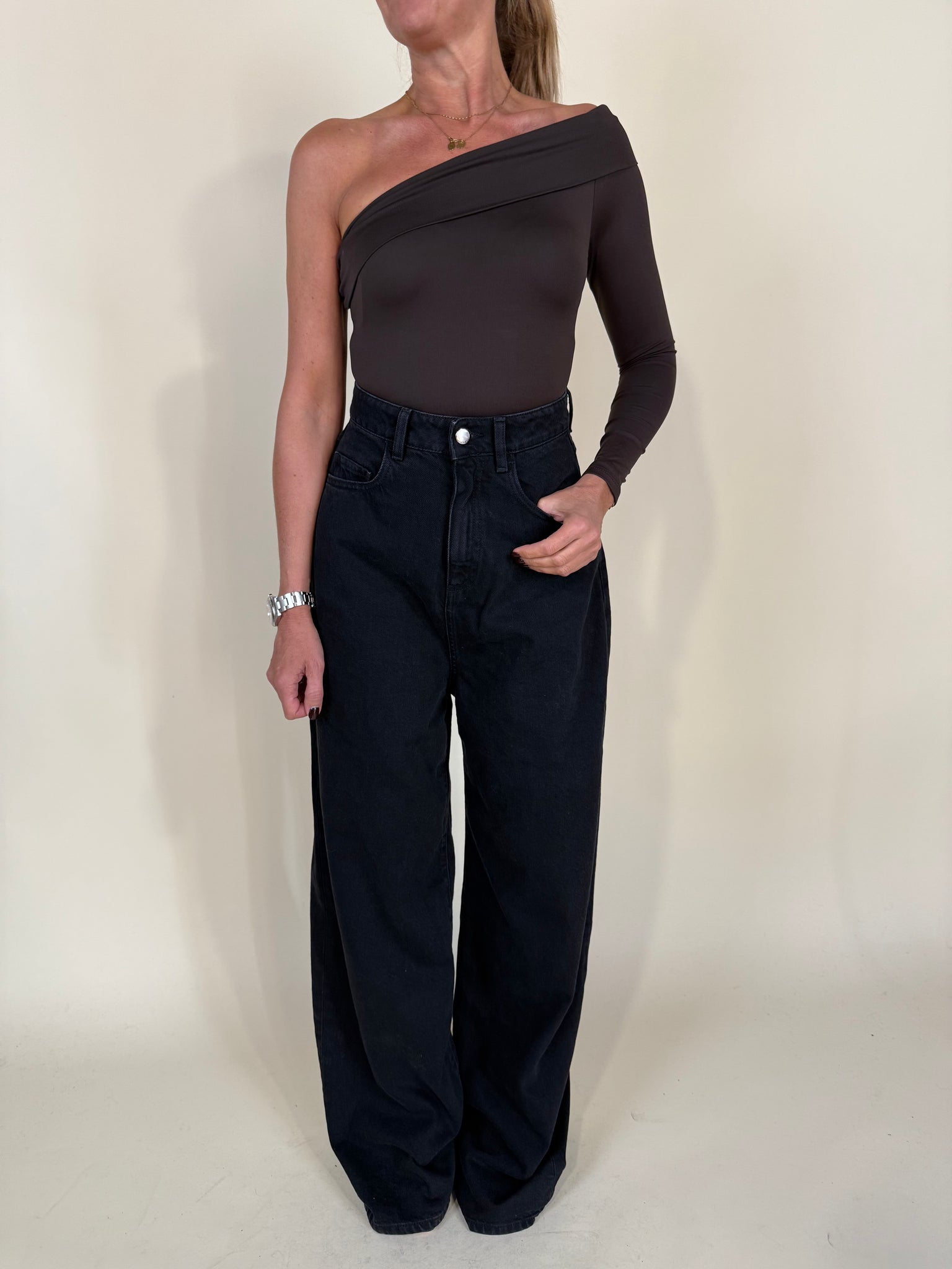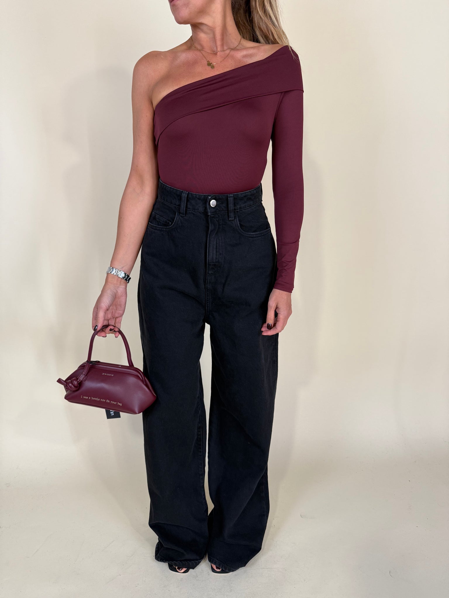 Maglia monospalla modello body disponibile nelle varianti colore moro e bordeaux.