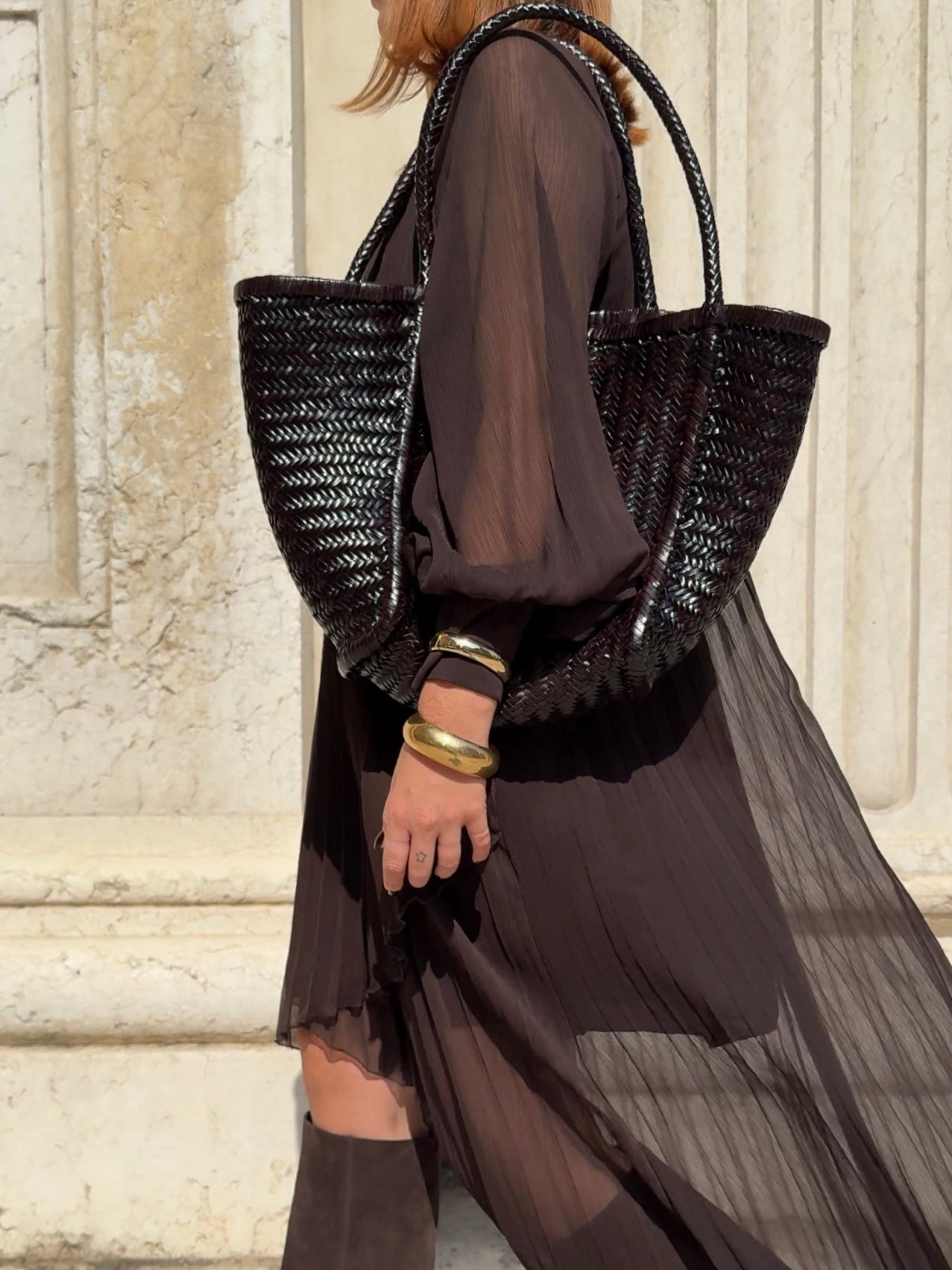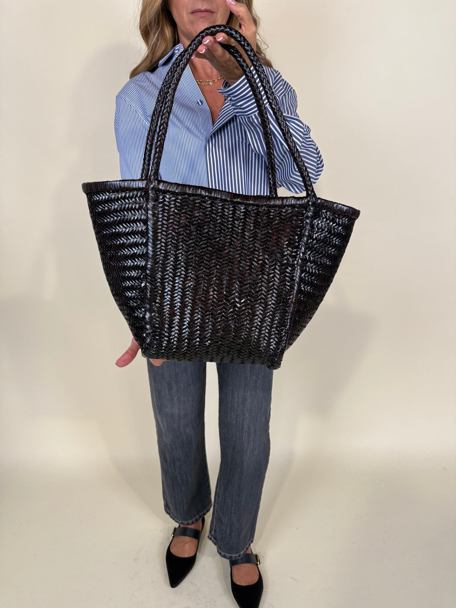 Borsa modello maxi shopping bag interamente lavorata ed intrecciata artigianalmente con pelli naturali e uniche, disponibile nei colori nero e moro. Modello a trapezio con dettaglio impuntura intrecciata lavorata a mano in entrambi i lati borsa. Manico intrecciato e bag in tela interna annessa. Taschina interna tono su tono con zip dorata.