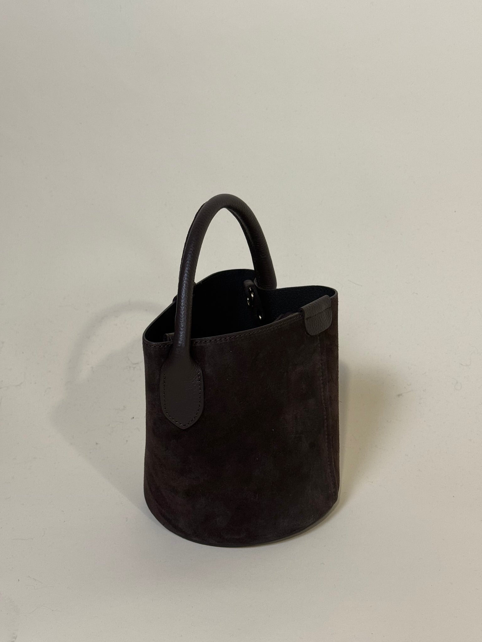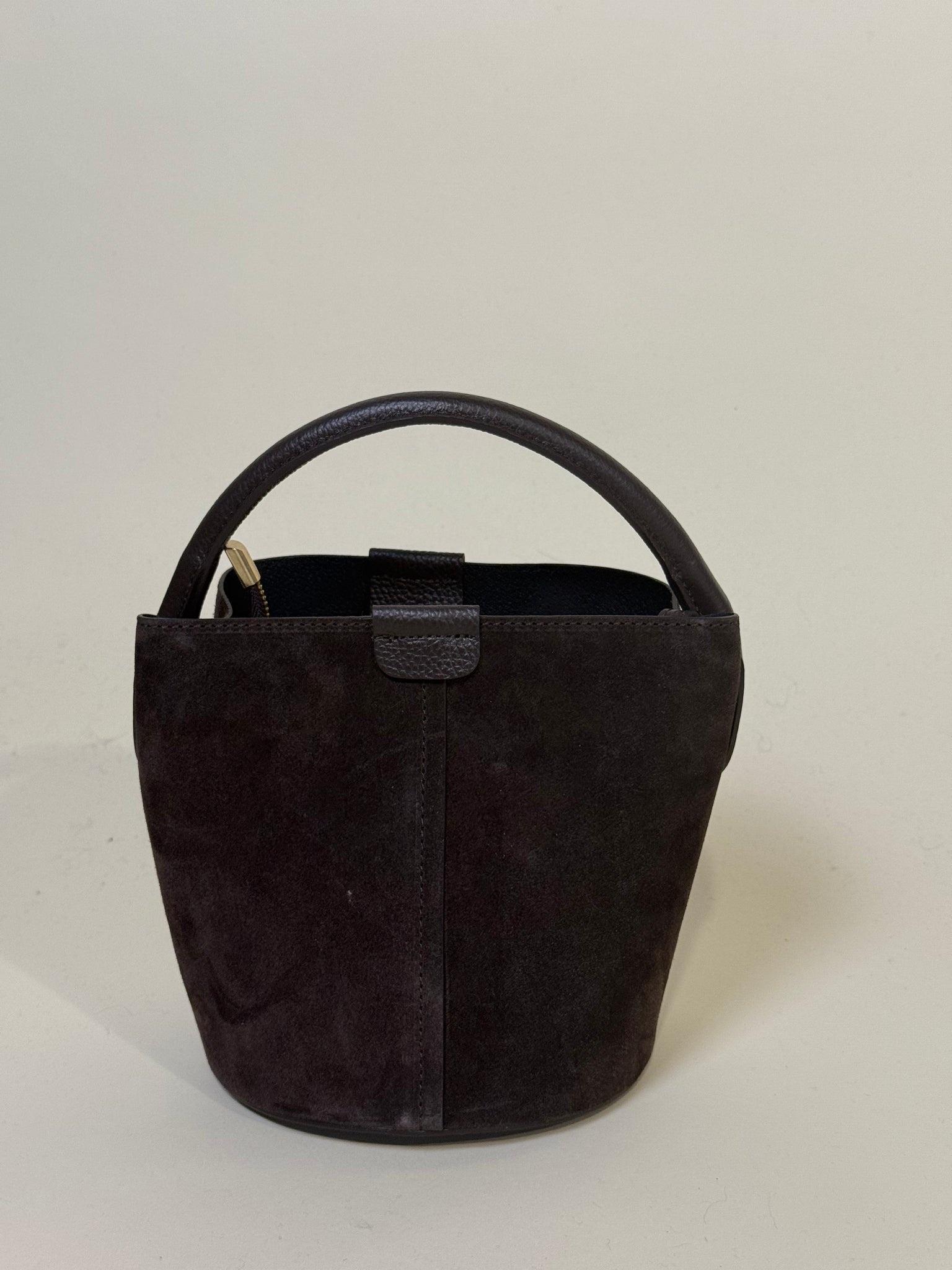 Borsa modello secchiello mini disponibile nella variante colore moro. Dettaglio esterno scamosciato moro tono su tono. Tracolla in ecopelle tono su tono. Modello chiusura con zip dorata.