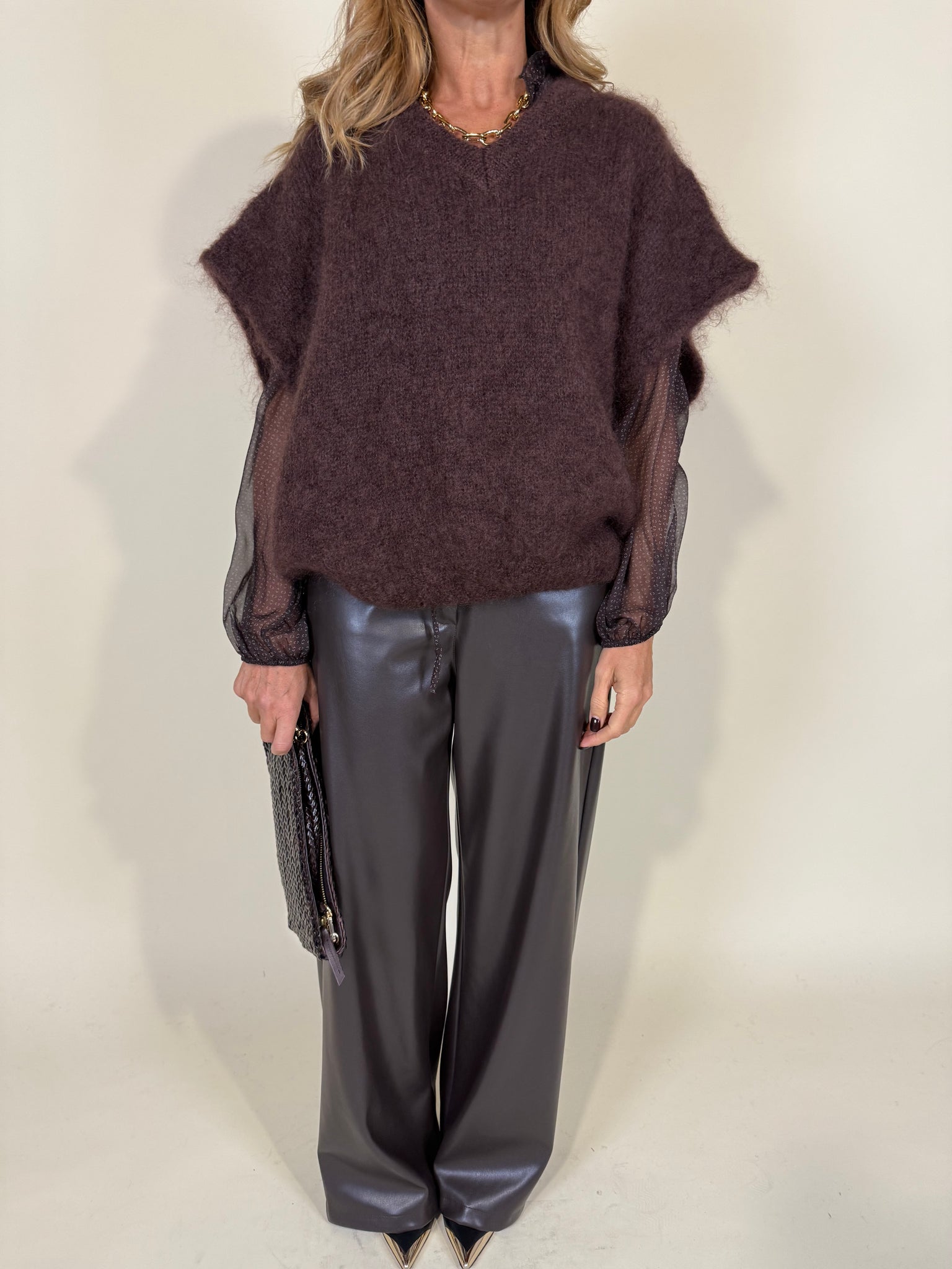 Camicia morbida oversize velata disponibile nella fantasia micro sui toni del violetto calda. Modello manica lunga con elastico sul polso e colletto arricciato con laccetti.