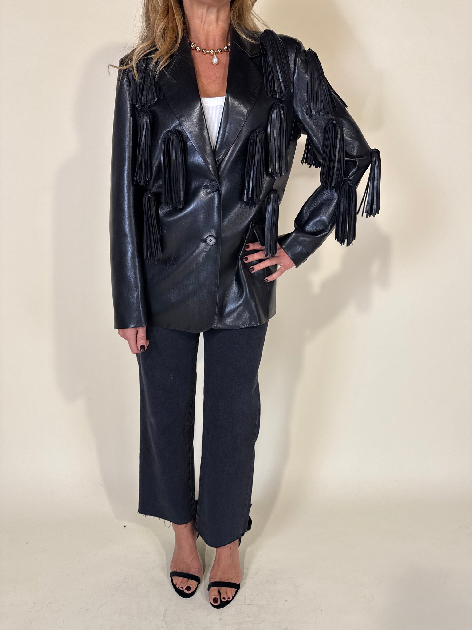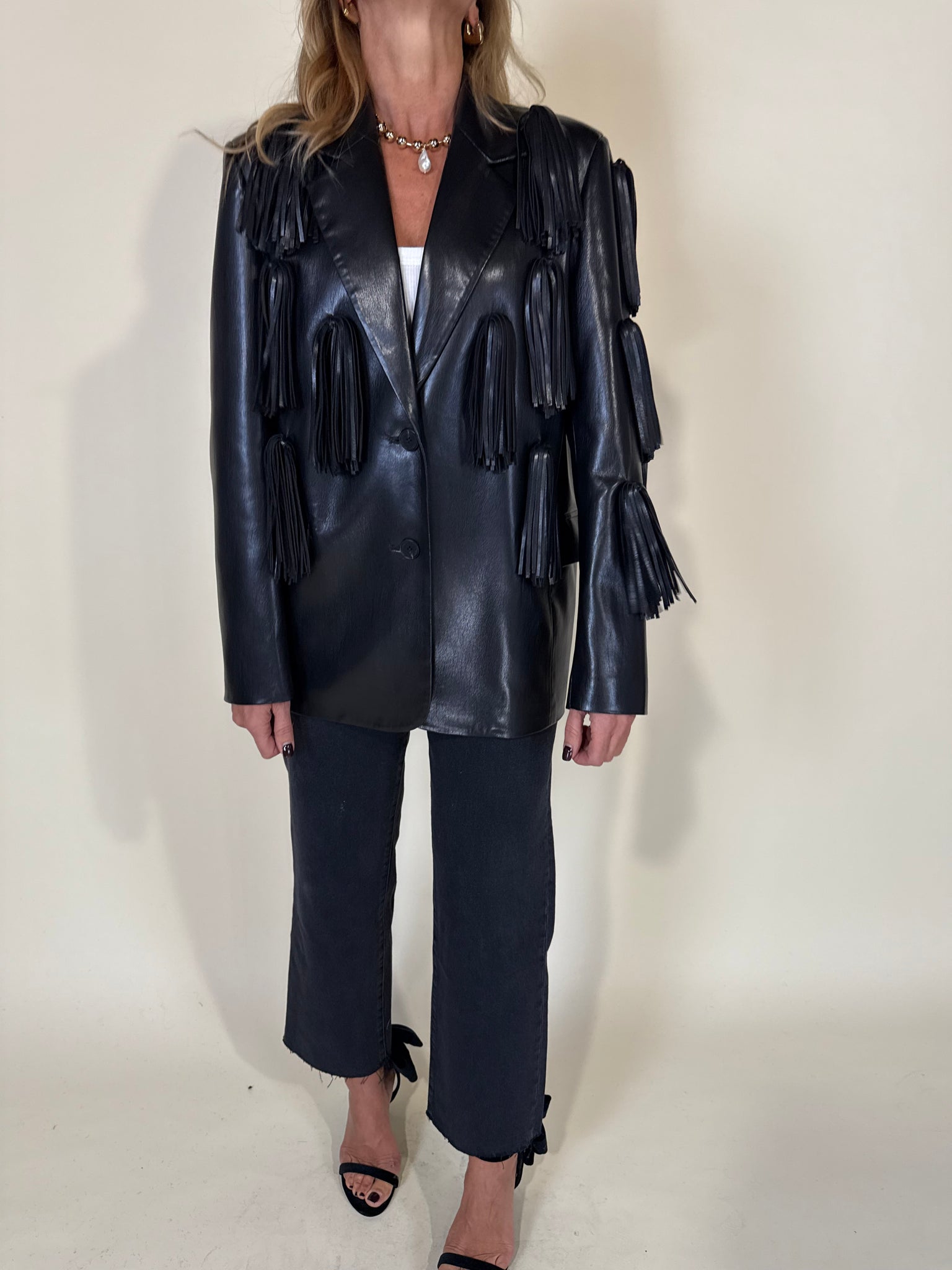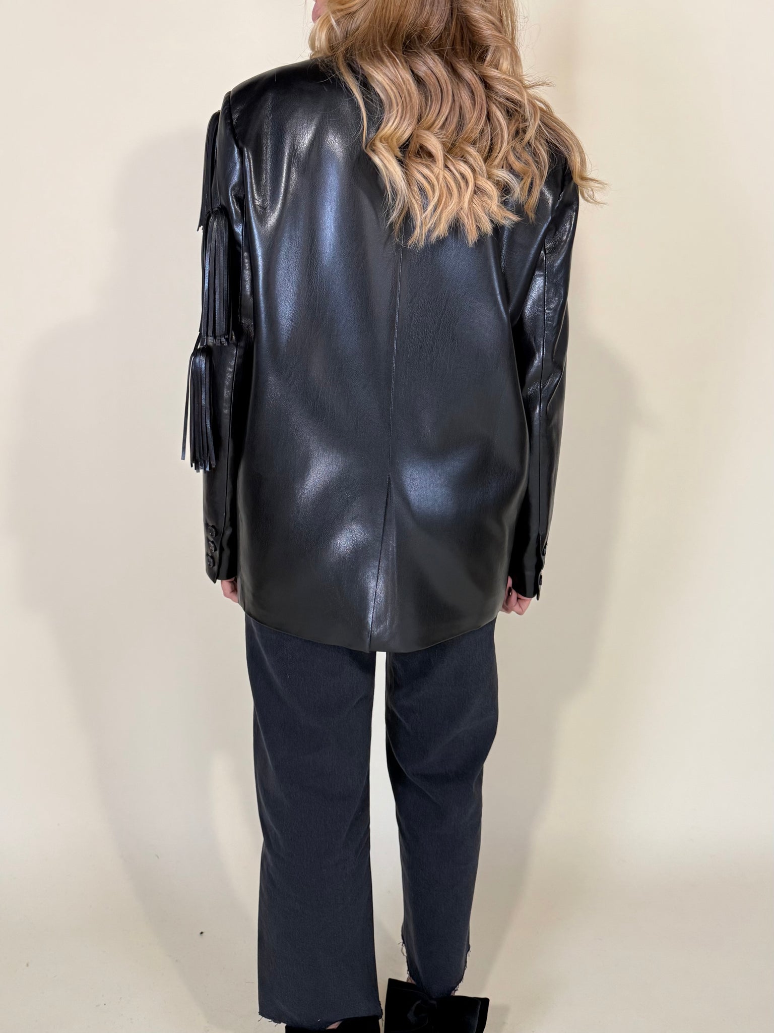 Giacca sartoriale in ecopelle disponibile nella variante colore nera lucida. Giacca con rever a lancia, modello chiusura monopetto con doppio bottone nero tono su tono. Dettaglio maxi nappe tono su tono in ecopelle applicate frontali sulla giacca. Modello oversize.