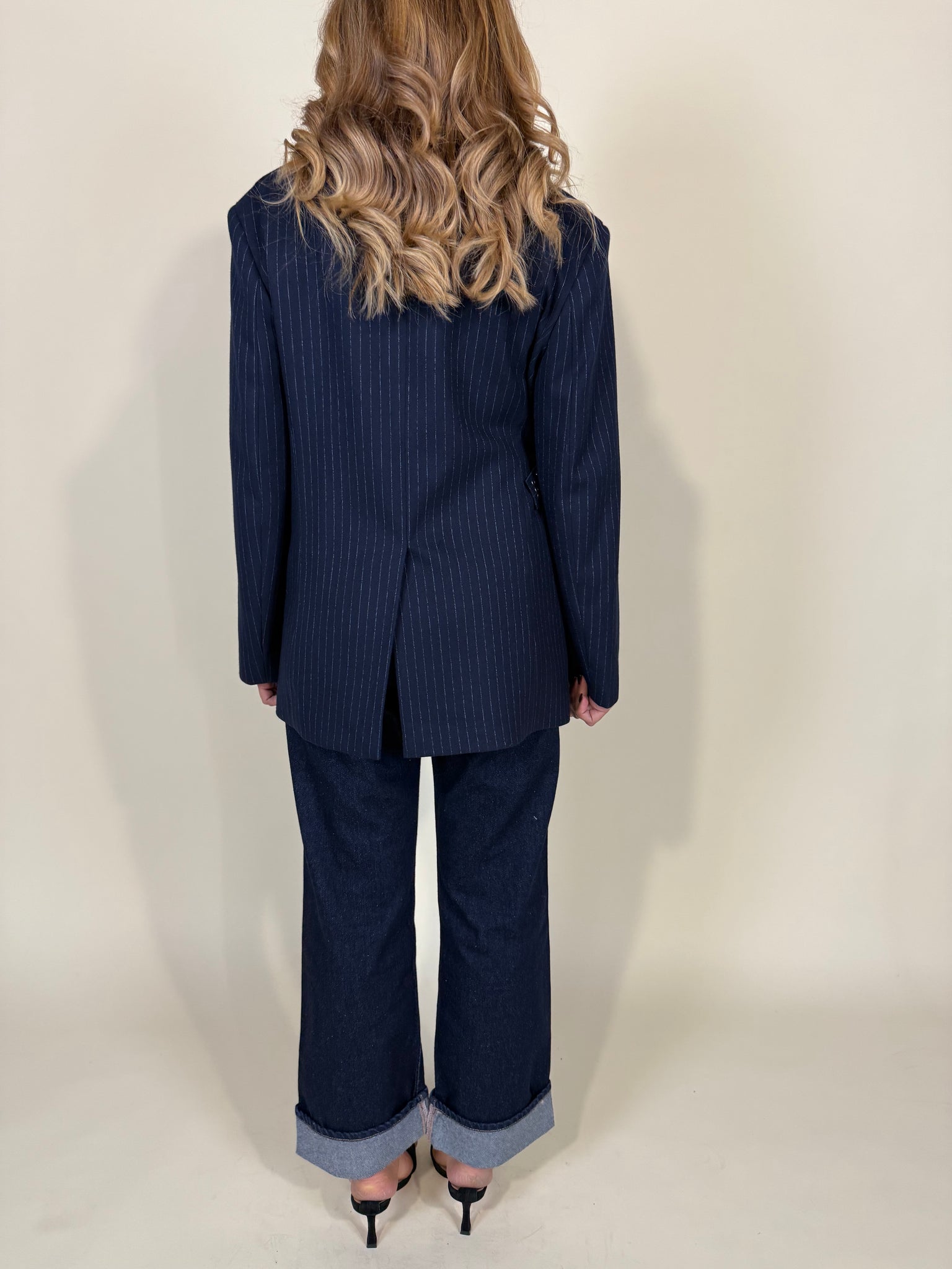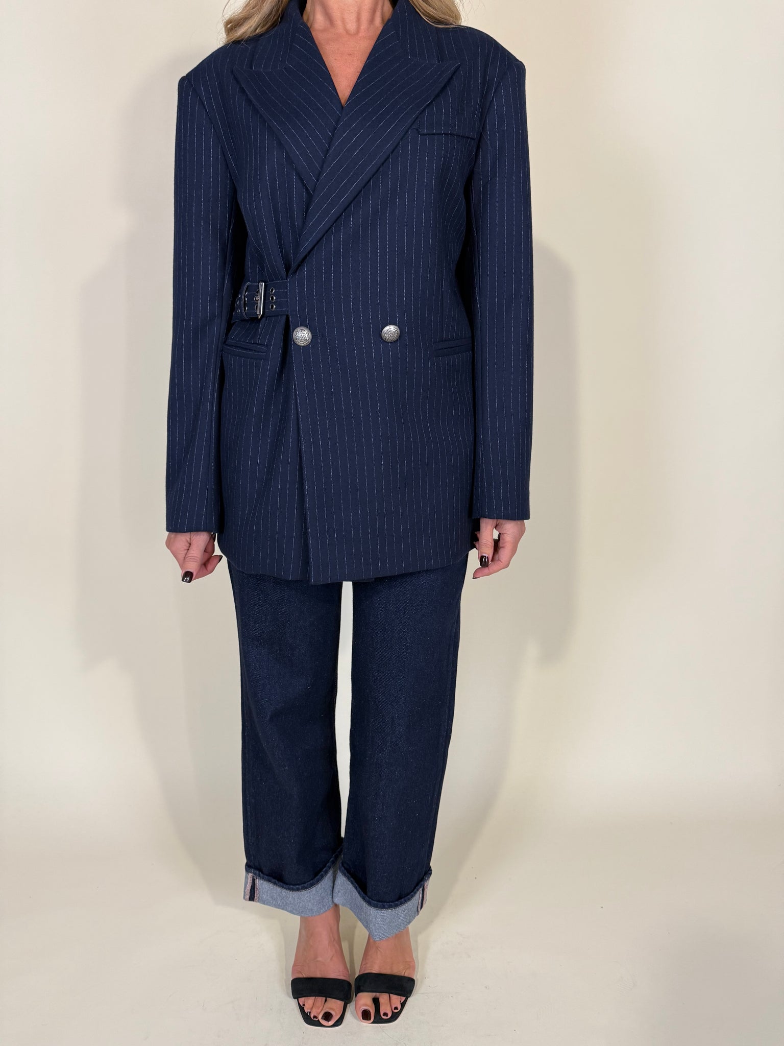 Giacca modello oversize blu notte in trama gessata disponibile nella variante colore blu notte. Modello con rever a lancia e chiusura a doppiopetto. Dettaglio cinturina laterale regolabile Taschine taglio classico applicate frontale. Fodera interna.