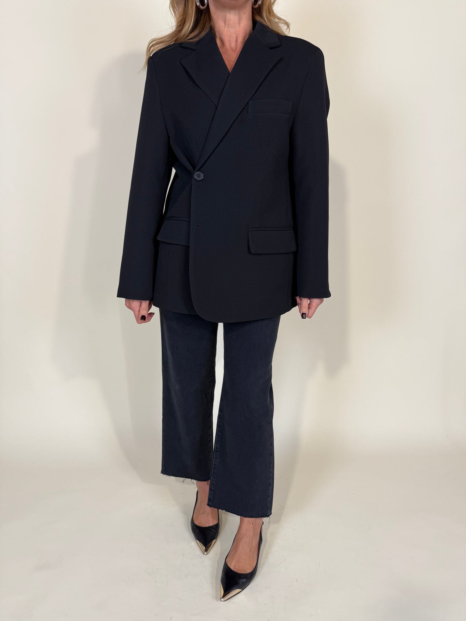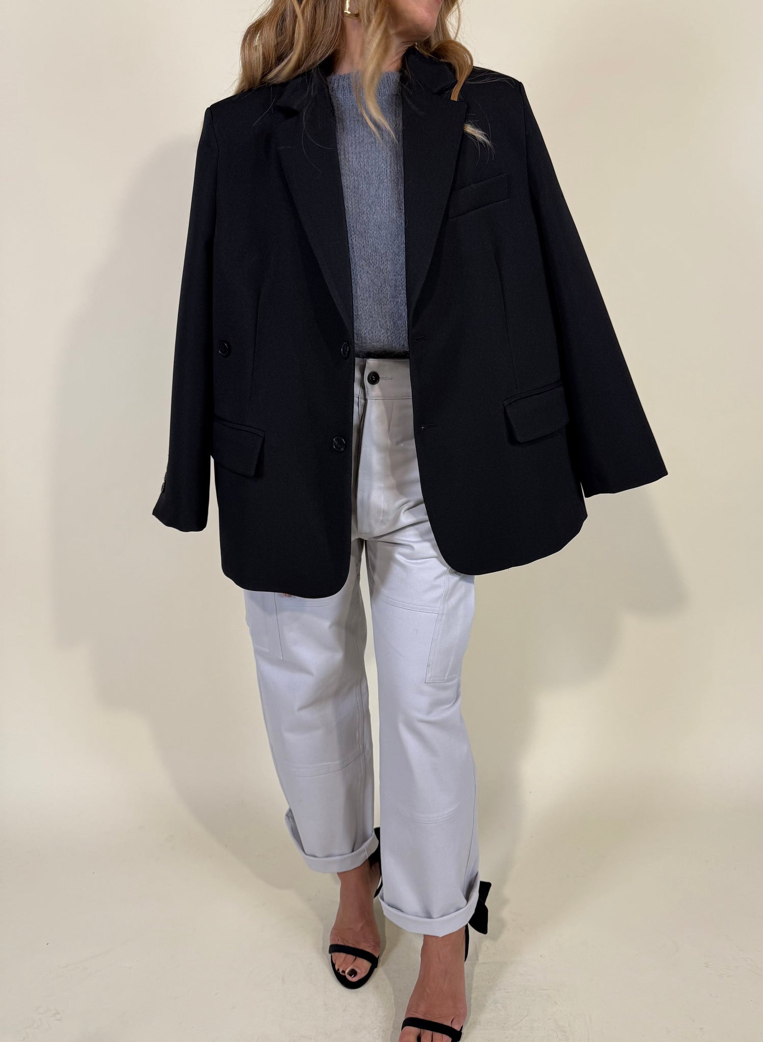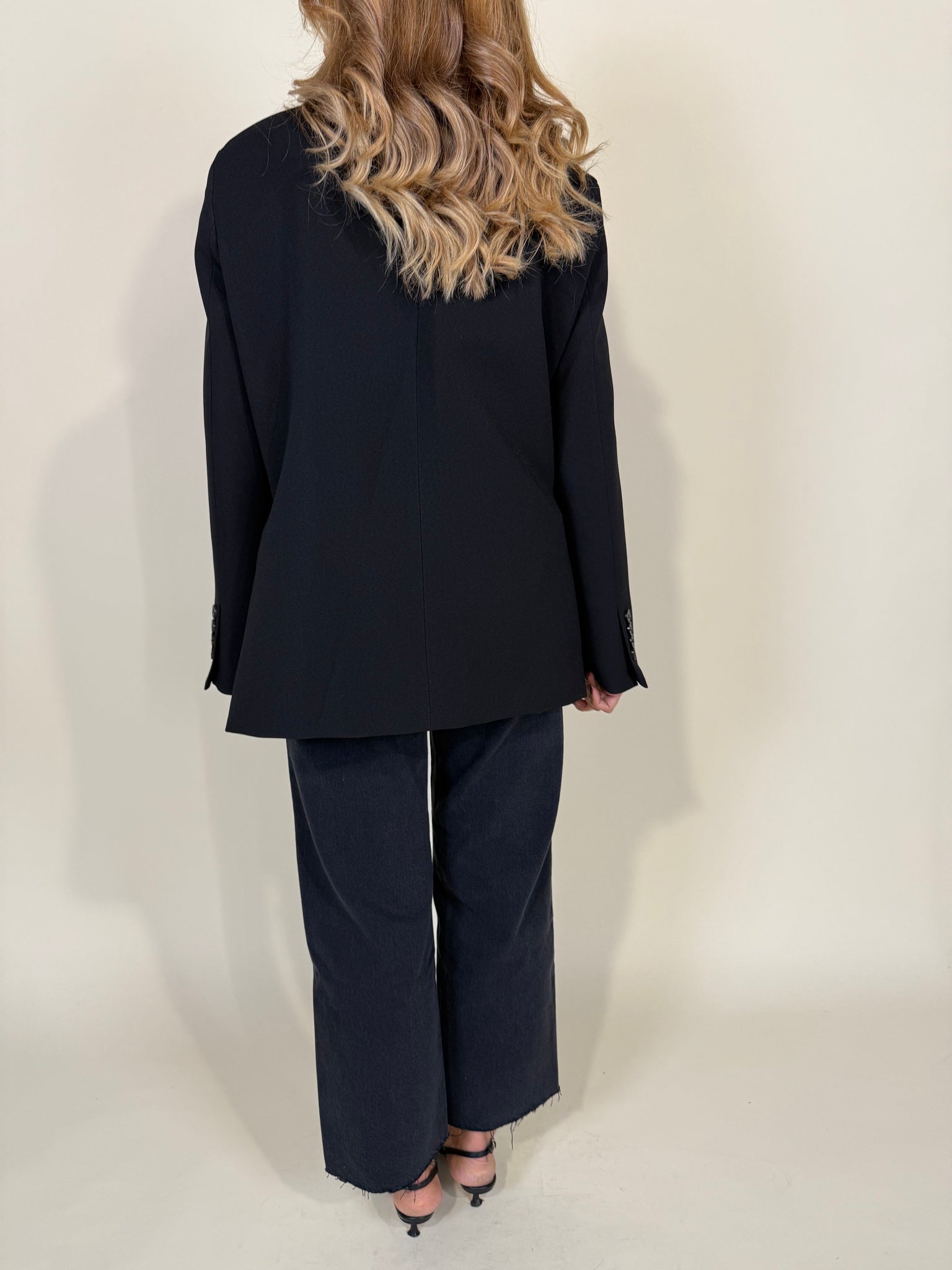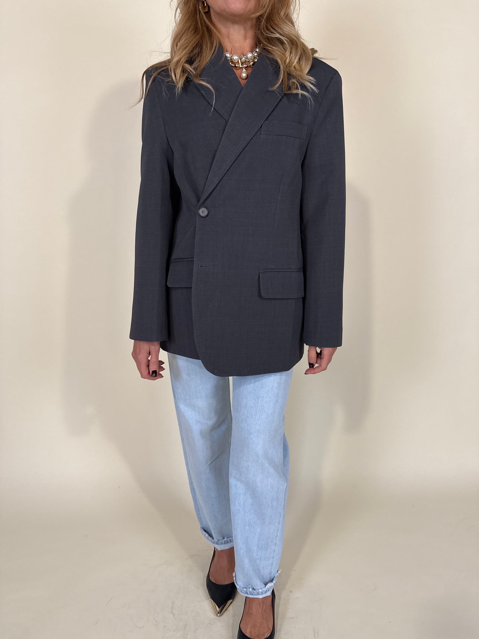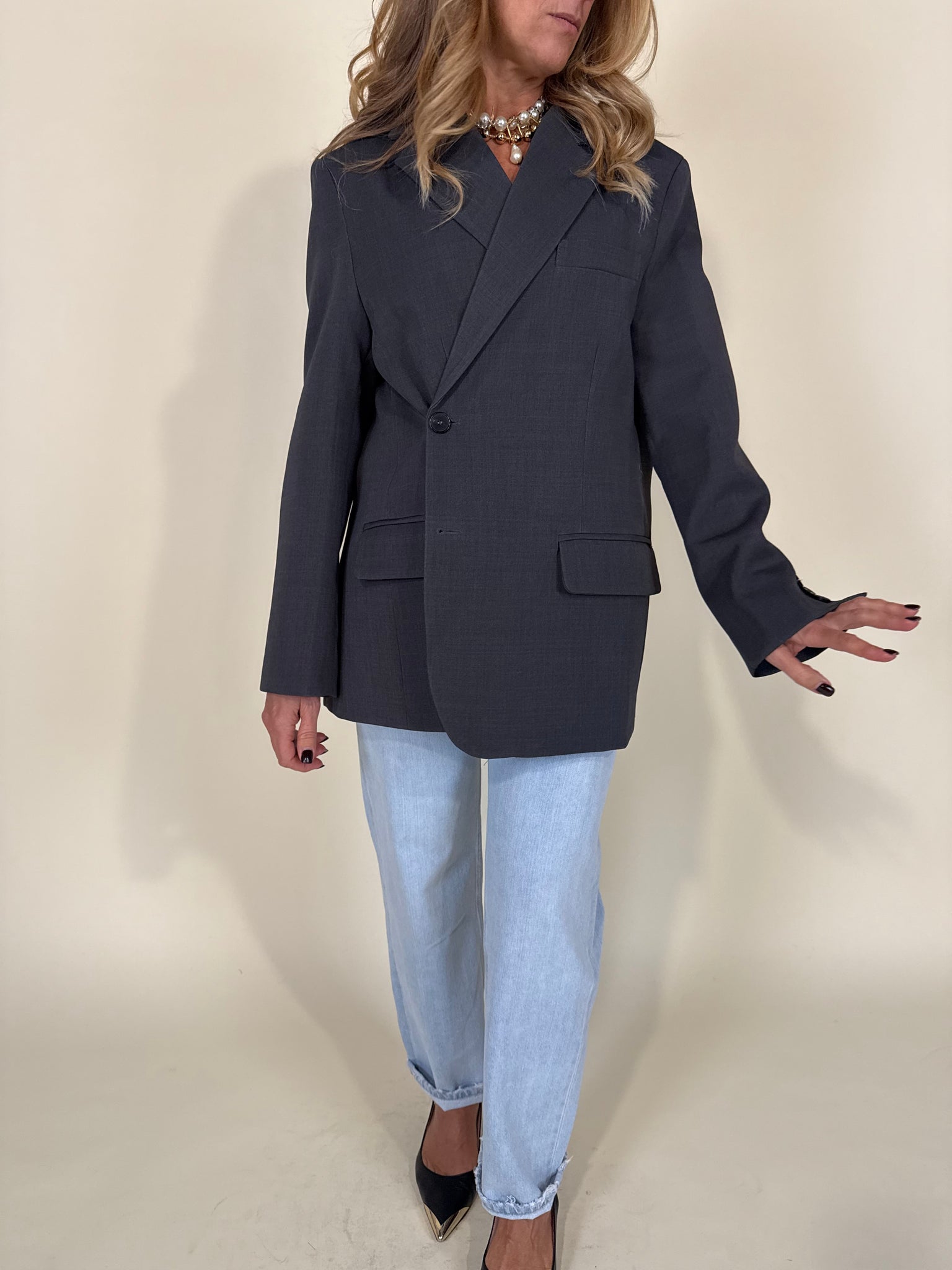 Giacca modello oversize disponibile nella variante grigia antracite e nera. Modello con spalla imbottita importante, modello doppiopetto laterale con bottoni tono su tono. Fodera interna e rever ampi. Modello taglio maschile. Tasche applicate taglio classico frontale.