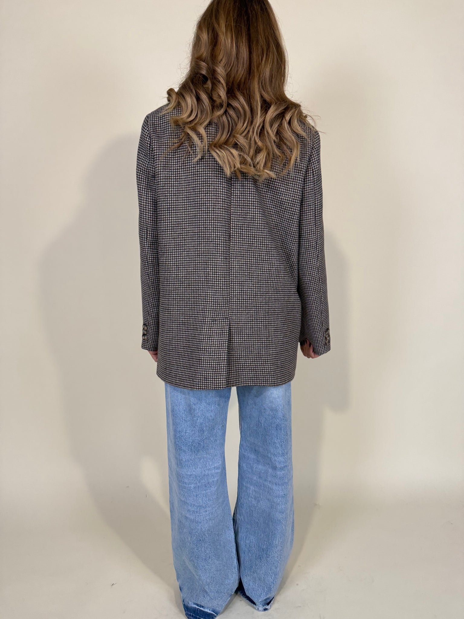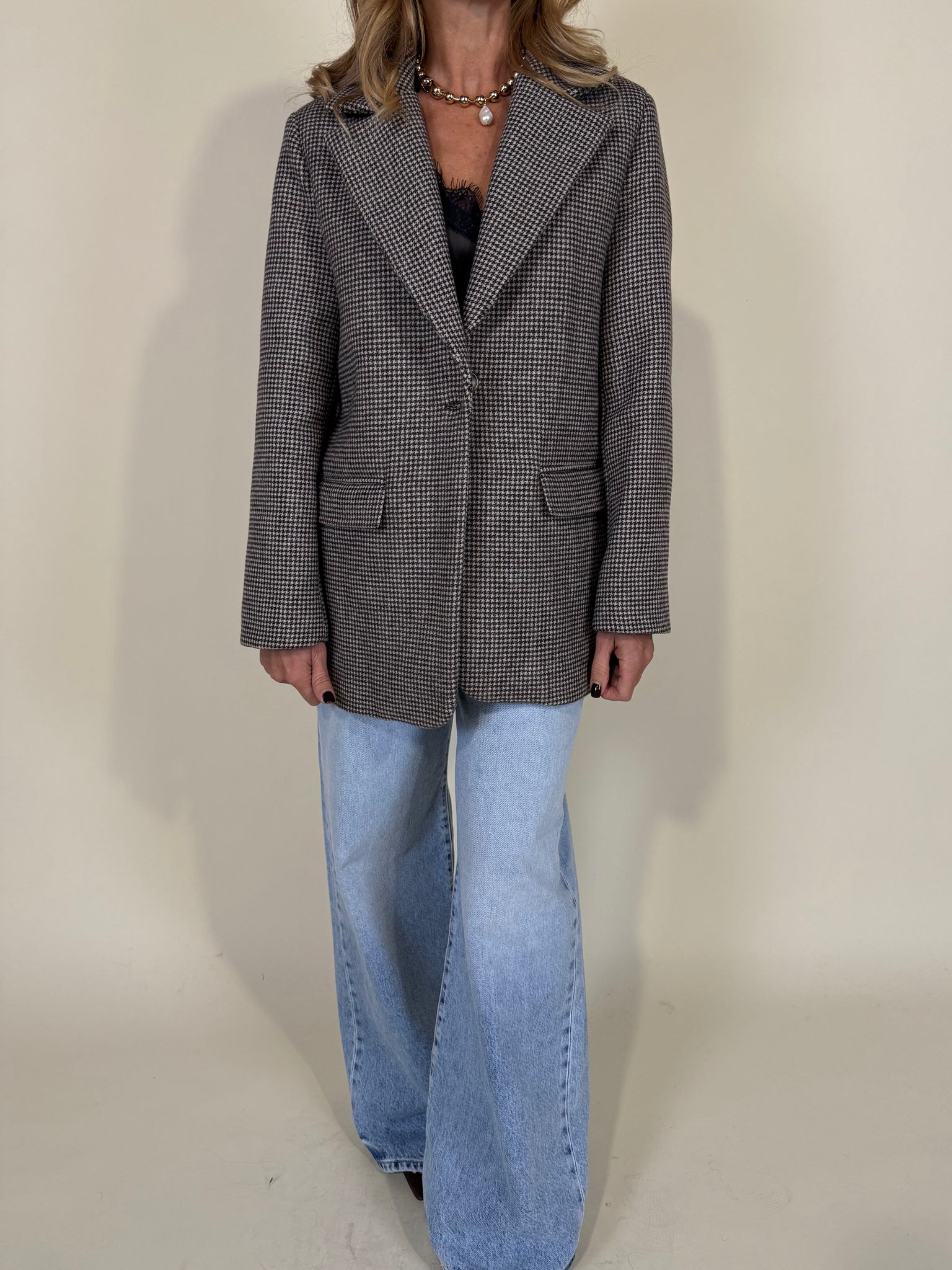 Giacca modello oversize in fantasia micro pied de poule sui toni del panna e moro scuro. Modello costruito con spalla imbottita. Rever ampio e chiusura monopetto con bottone unico. Fodera interna.