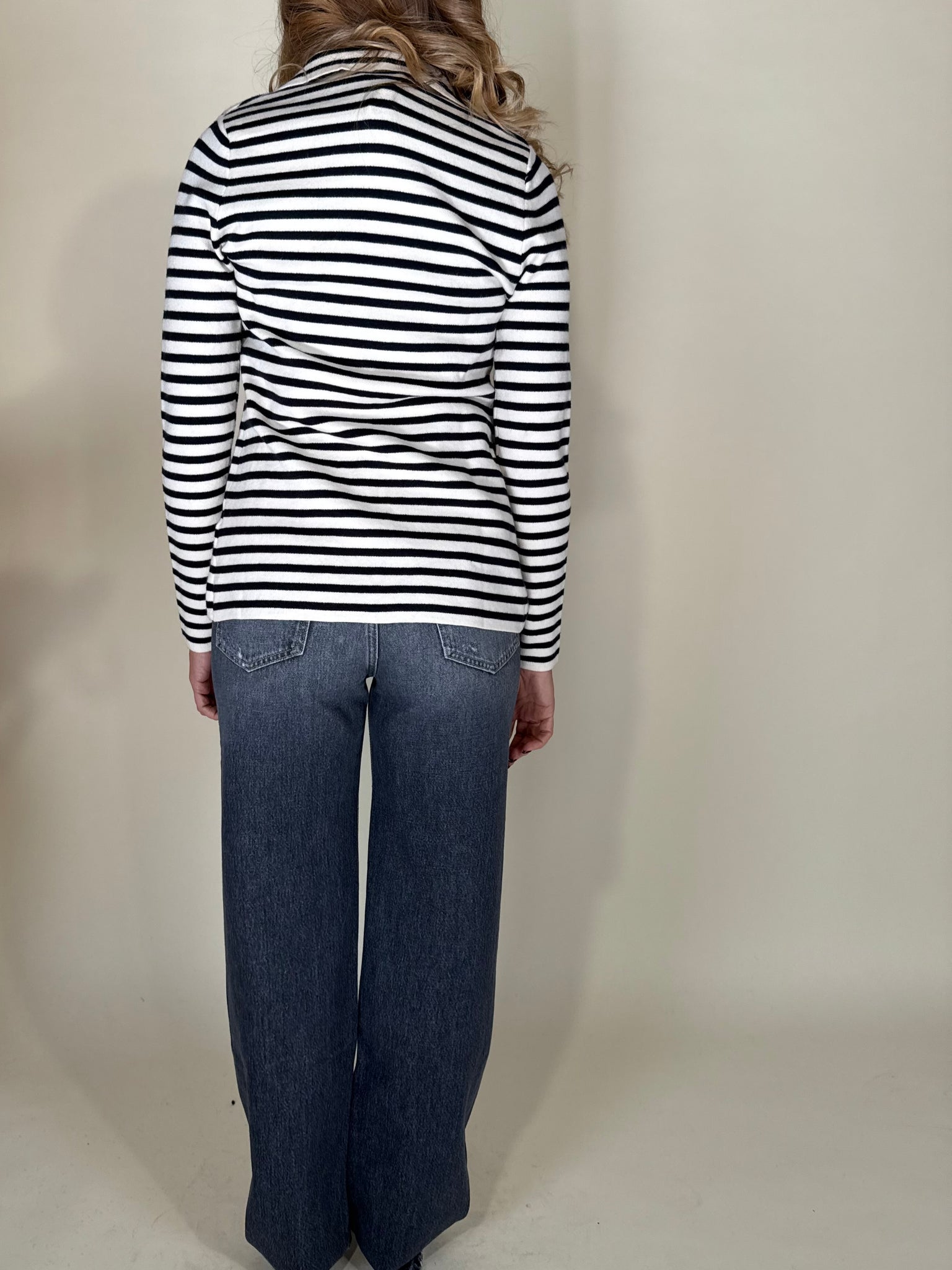 Giacchina modello cardigan in stampa a righe nero su crema. Modello con colletto morbido e chiusura monopetto a bottone unico nero. Profilo a contrasto nero. Taschine applicate frontali.