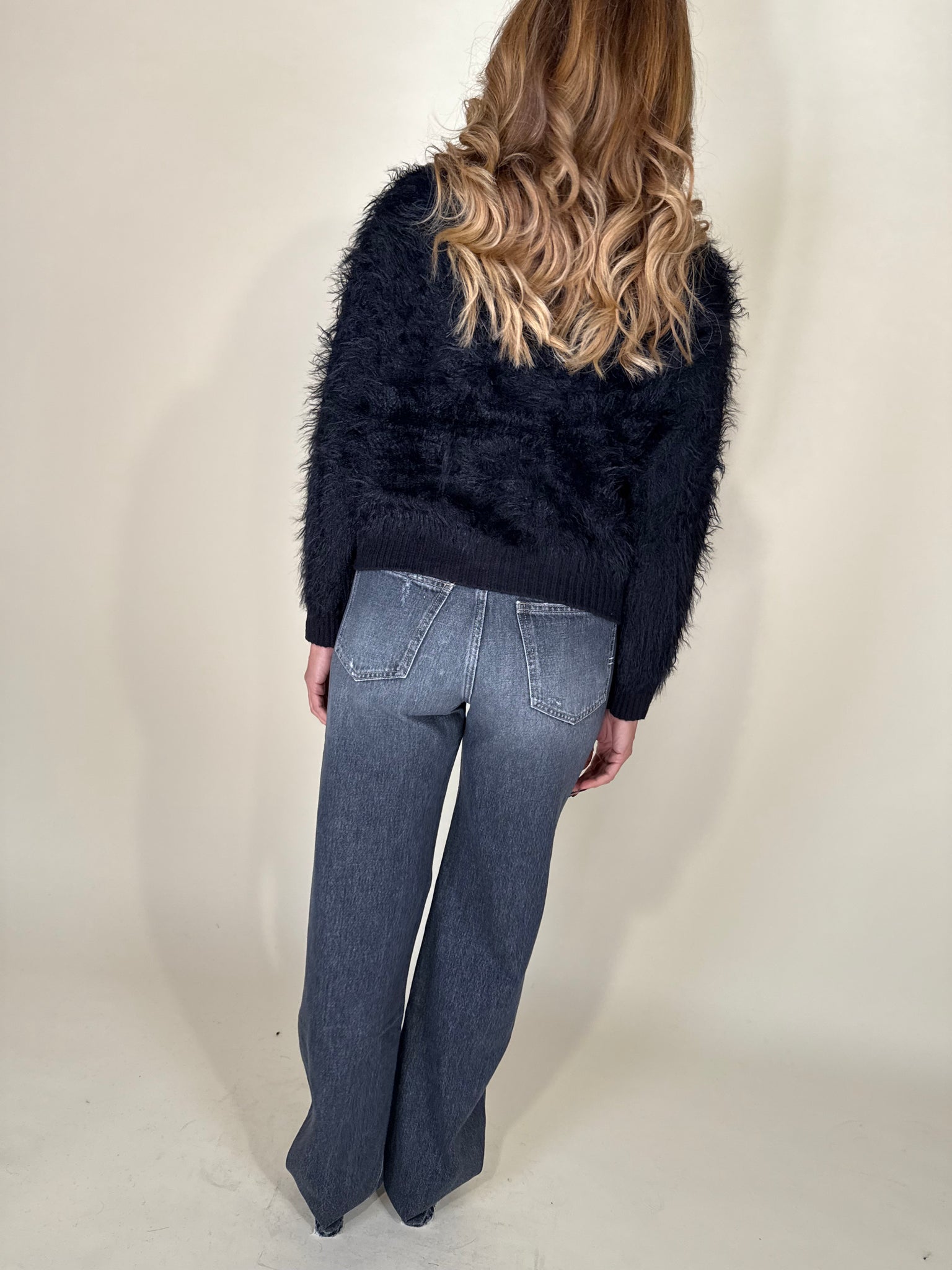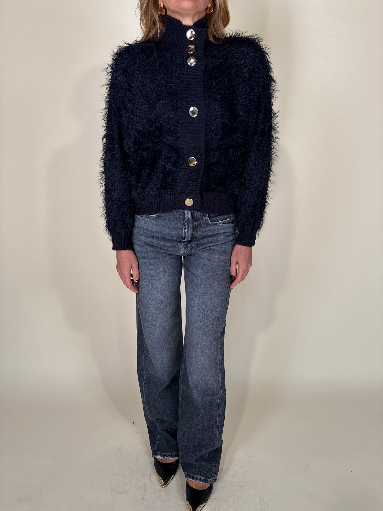 Giacchino modello cardigan disponibile nella variante colore nera. Modello con tessuto effetto pelo tono su tono morbidissimo. Modello con collo a lupetto e profili a maxi costina tono su tono. Chiusura con maxi bottoni dorati.