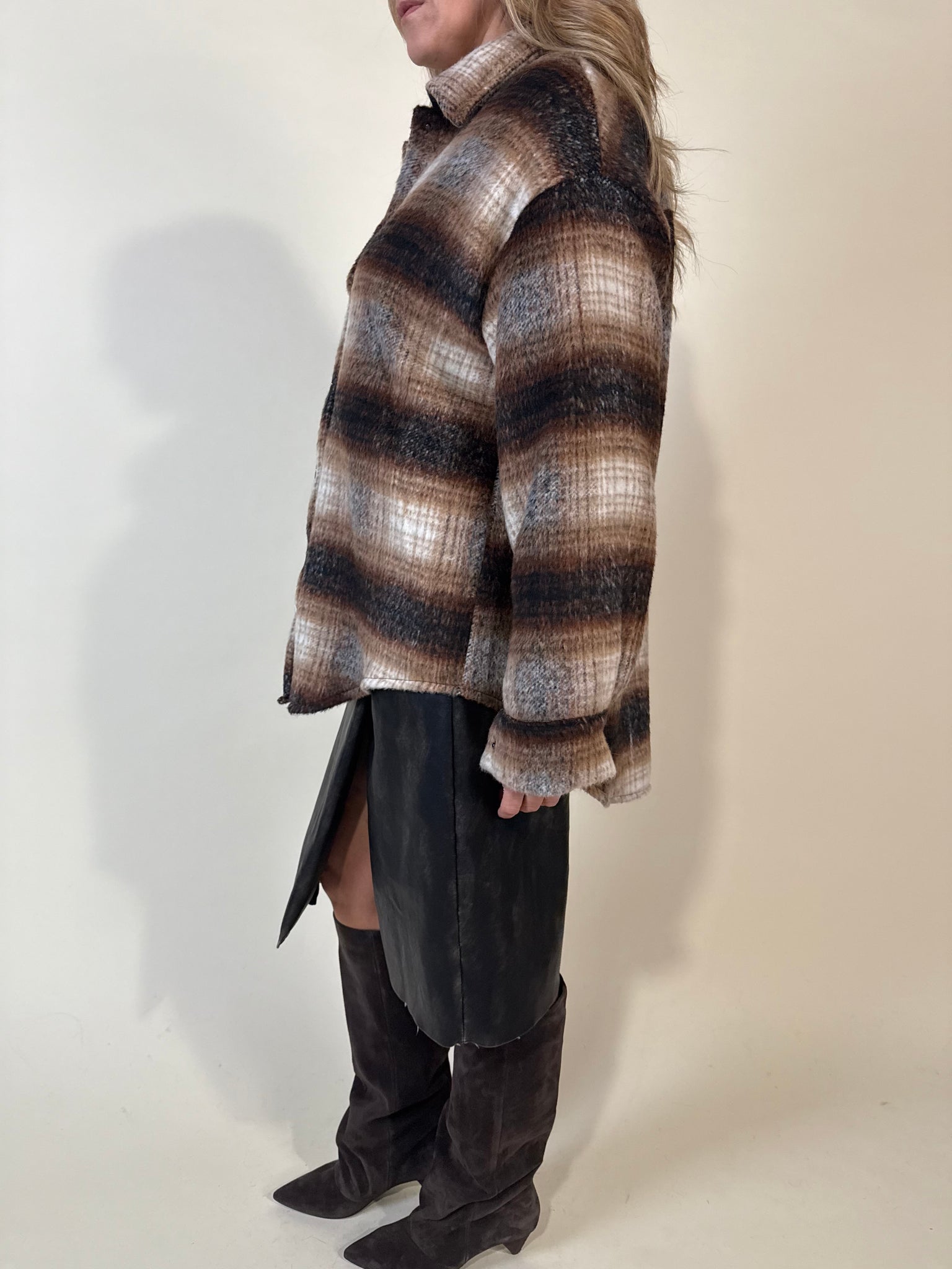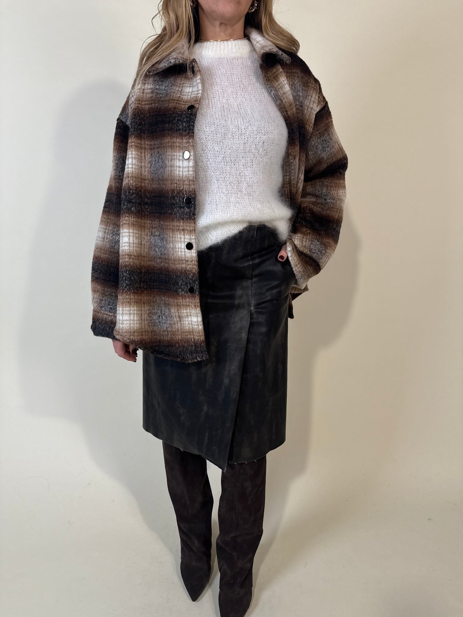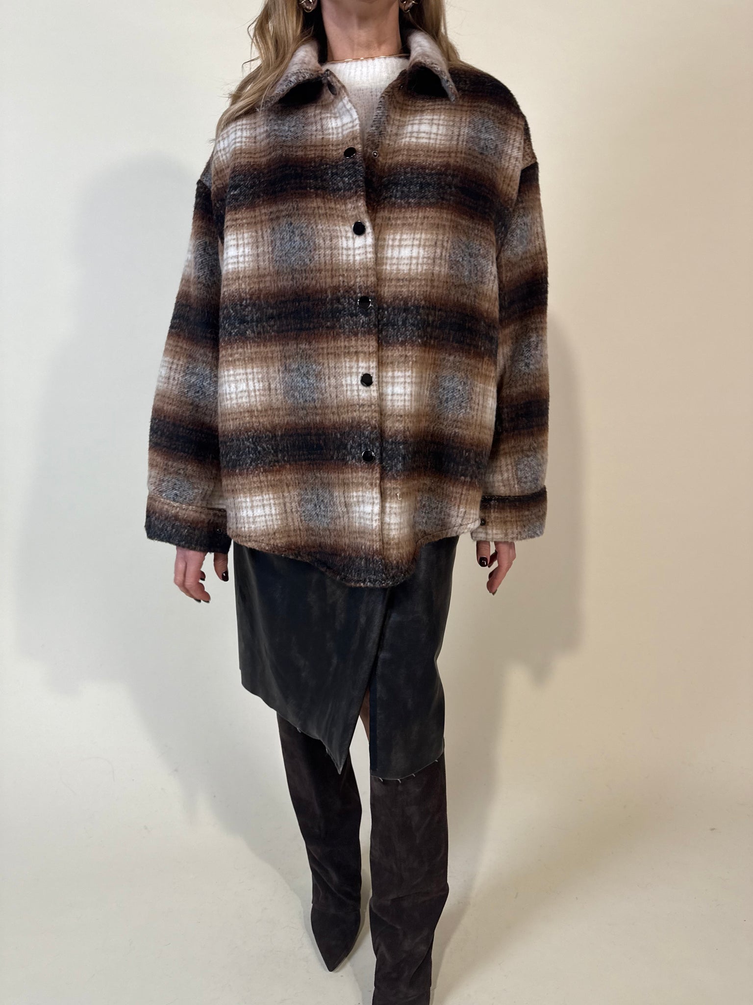 Giacchino modello maxi camicia oversize in tessuto effetto flanella pelosa disponibile nelle varianti in check moro e giallo, camel e panna e moro con dettaglio filo fucsia. Modello con colletto e chiusura a bottoni a pressione centrali.