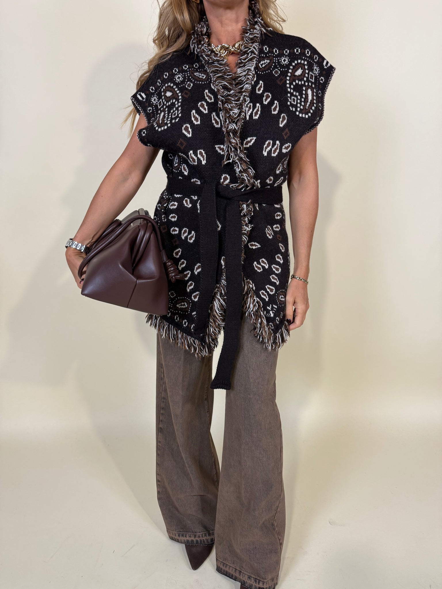 Cardigan modello gilet in stampa bandana nelle varianti colore taupe e moro con fantasia a contrasto. Dettaglio sfrangiatura a profilo e smanicatura liscia. Cinturina annessa tono su tono.