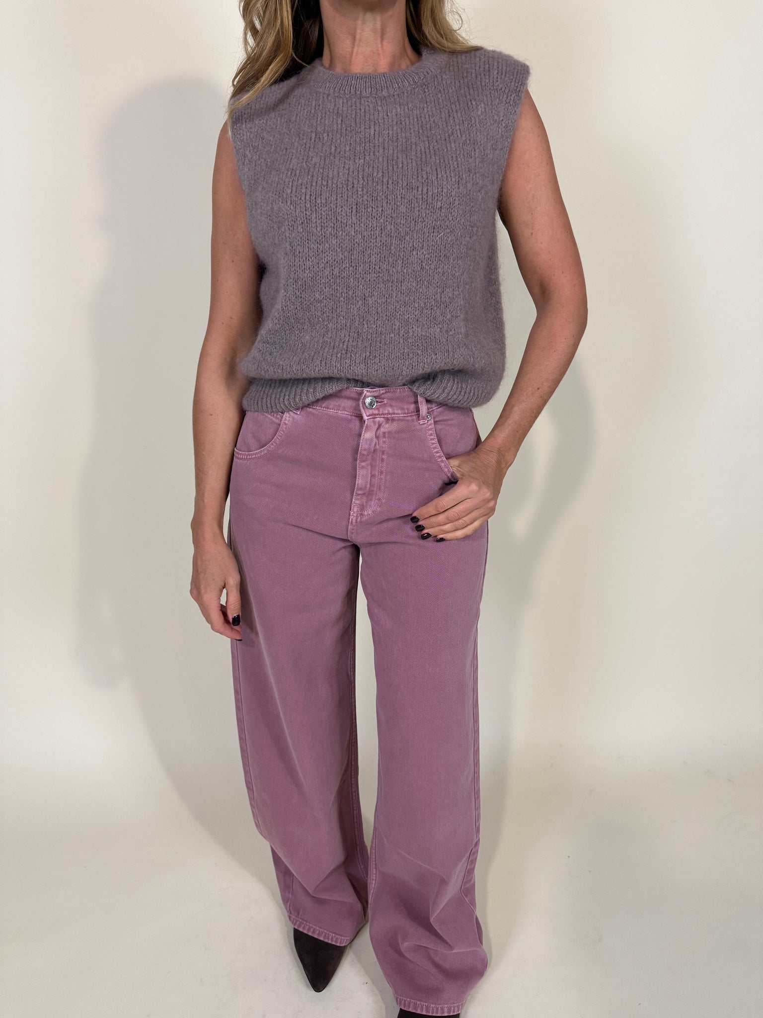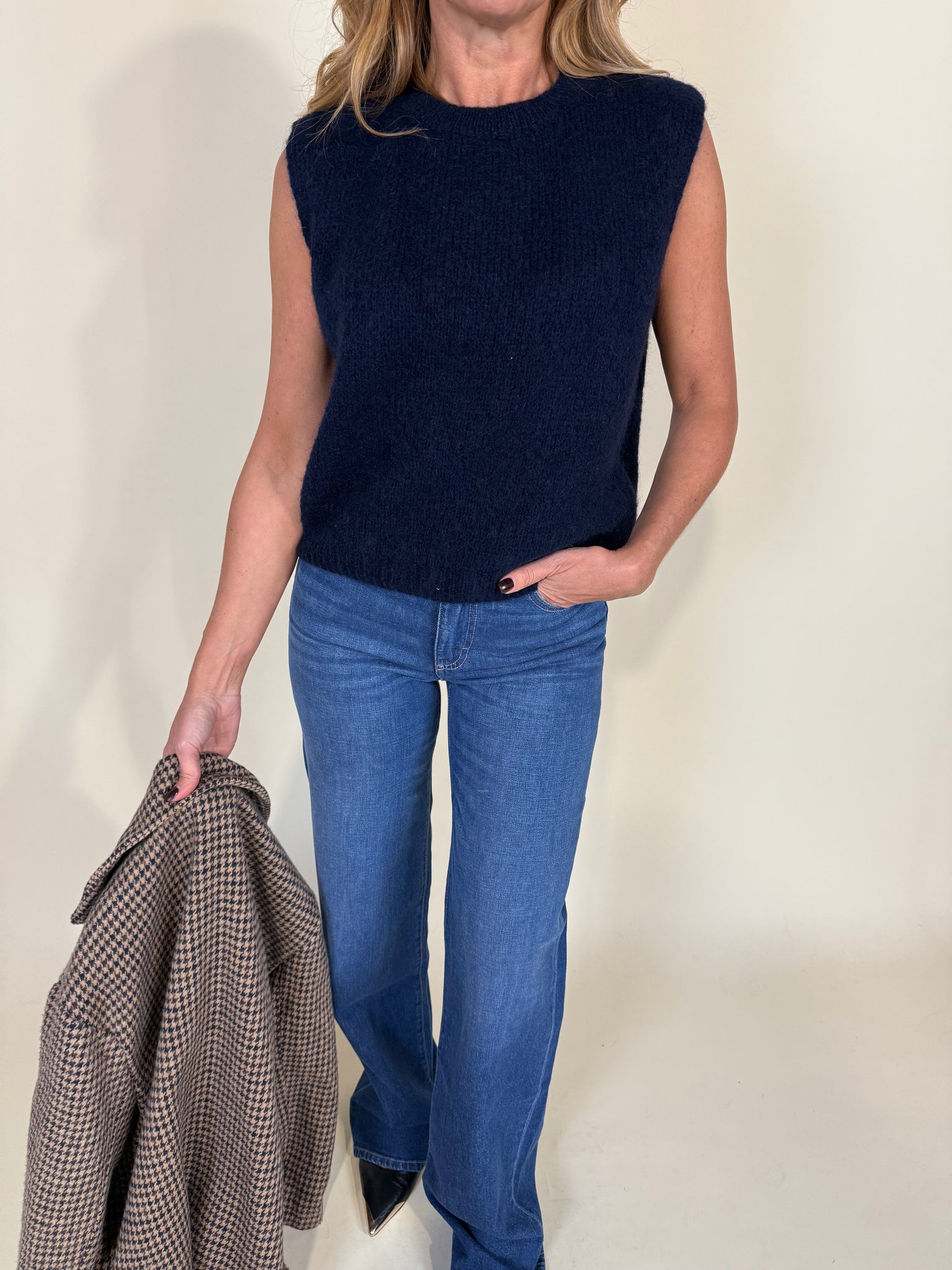 Gilet morbido in misto lana e mohair disponibile nelle varianti colore beige e blu notte.