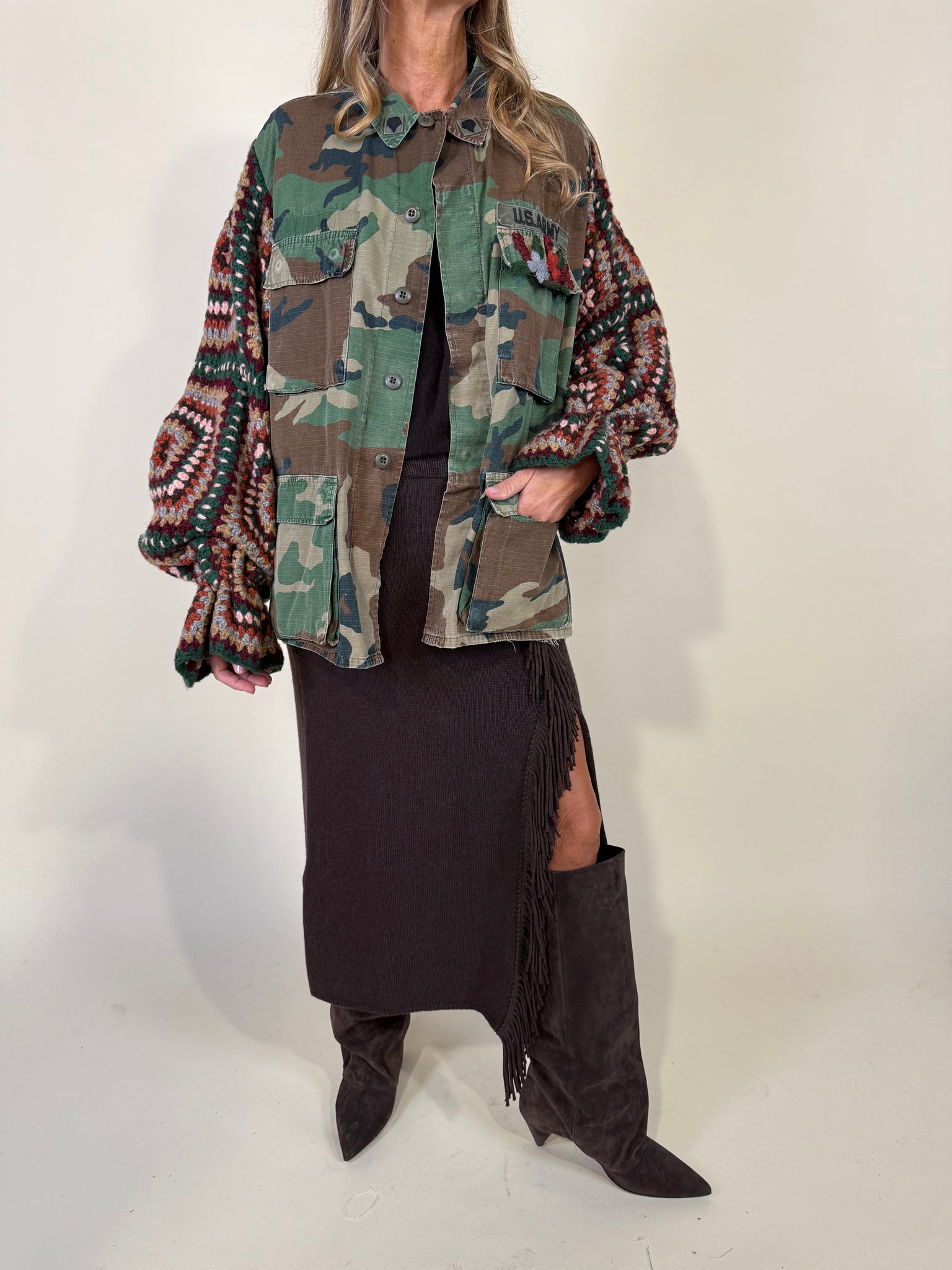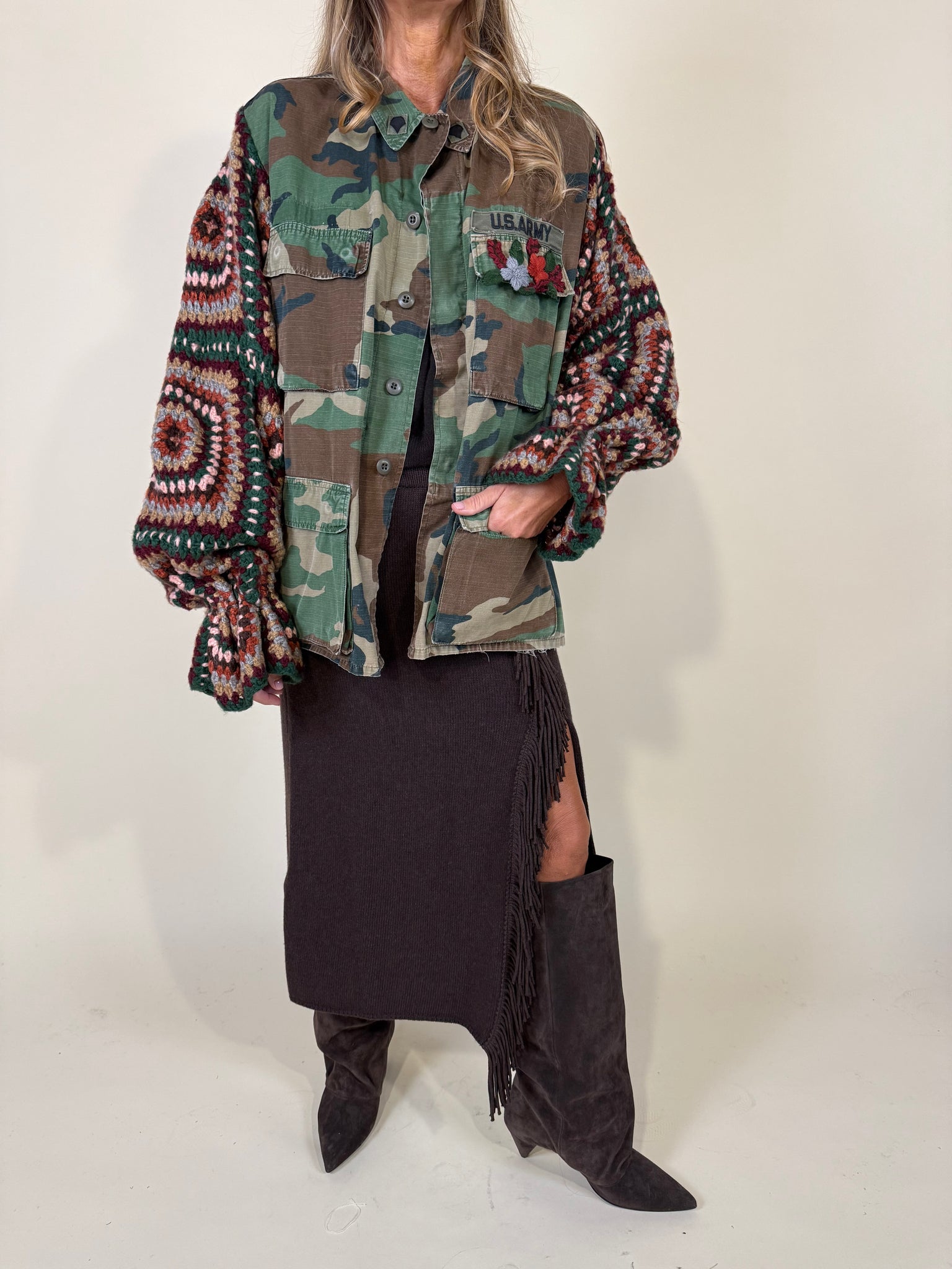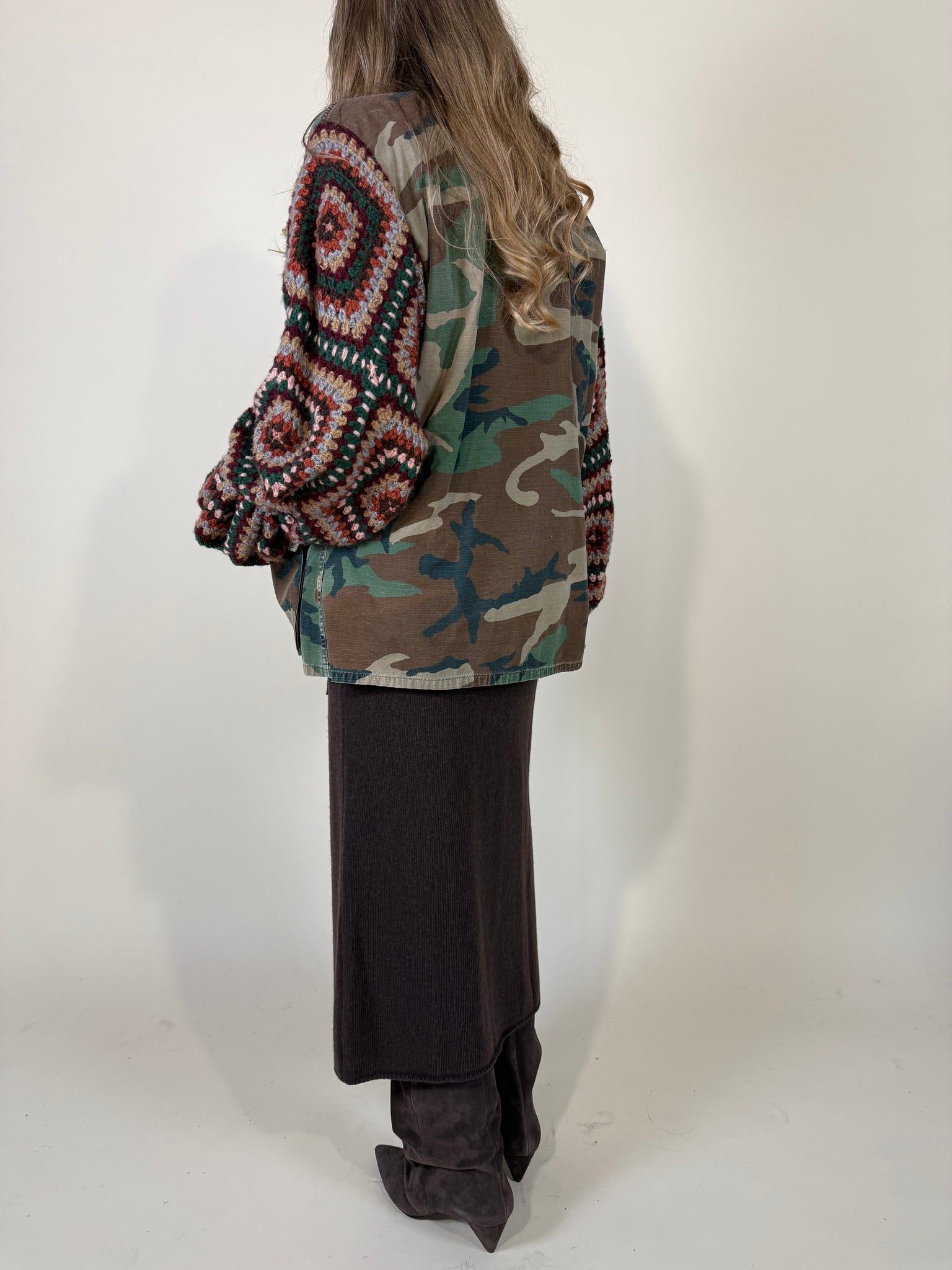 Sahariana military con maniche in crochet sui toni del rosa antico, camel e verde. Fodera interna rimovibile con ecopelliccia rasata interna caldissima sui toni del camouflage. Parte esterna in camouflage in 100% cotone.