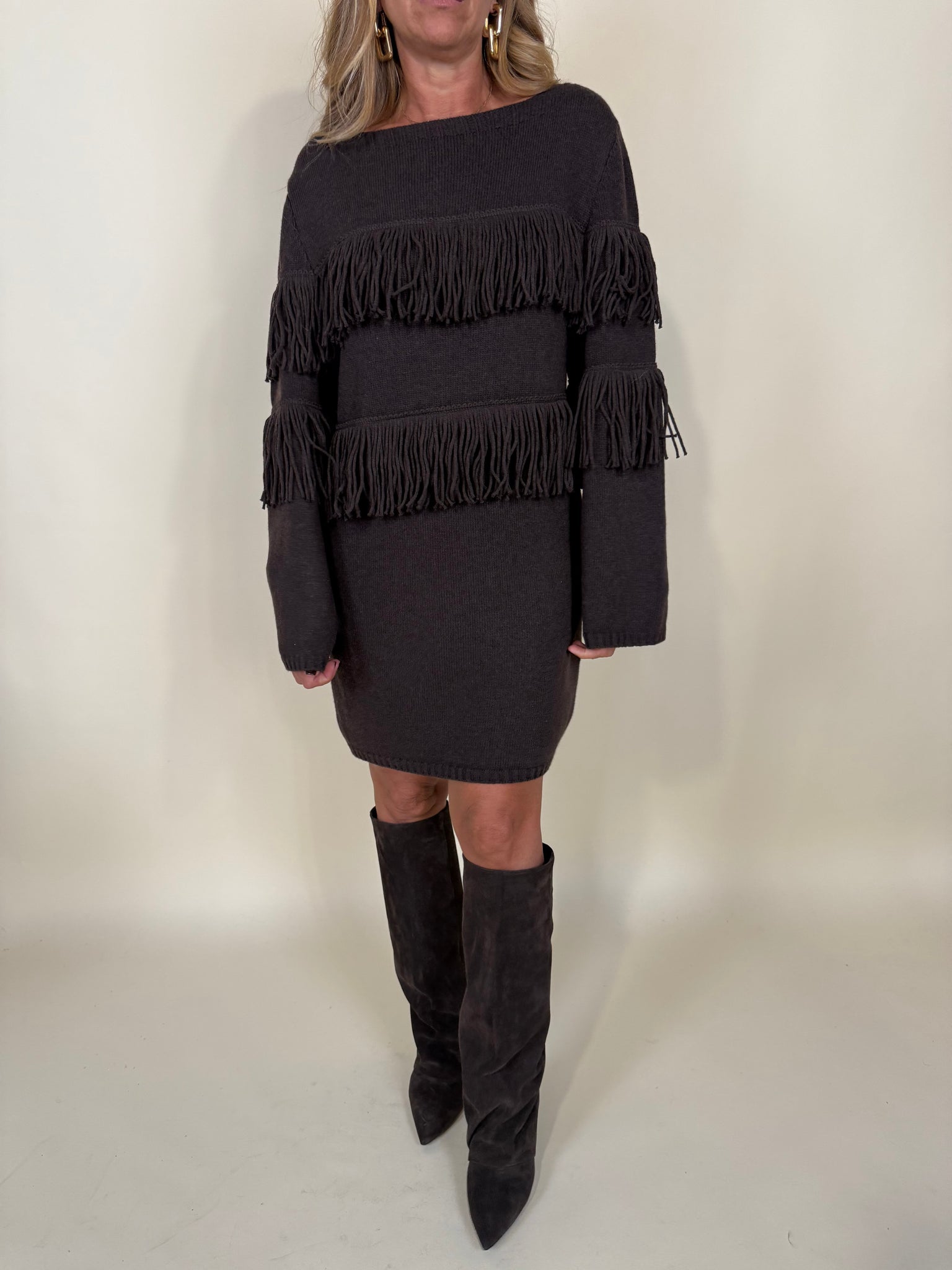 Abito corto in maglia disponibile nella variante colore unica testa di moro. Dettaglio scollo morbido a barchetta con profilo a costina. Dettaglio frange applicate frontali tono su tono a ricamo e su tutto il giro manica alta. Fondo manica a clessidra ampio e morbido.